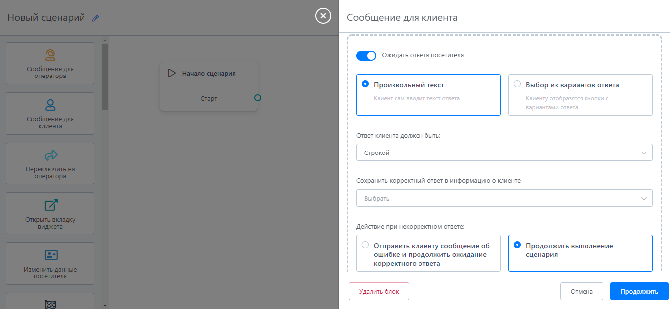 В блоке “Сообщение для клиента” выберите “Ожидать ответа посетителя” - “Произвольный текст” - “Продолжить выполнение сценария”..png)