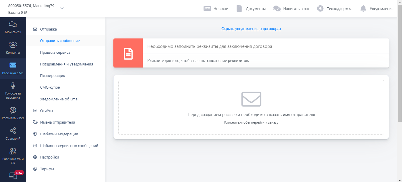 В вашем Личном Кабинете перейдите в раздел “Рассылка СМС”. Перед отправкой СМС рассылки вам необходимо заключить договор и заполнить реквизиты..png)