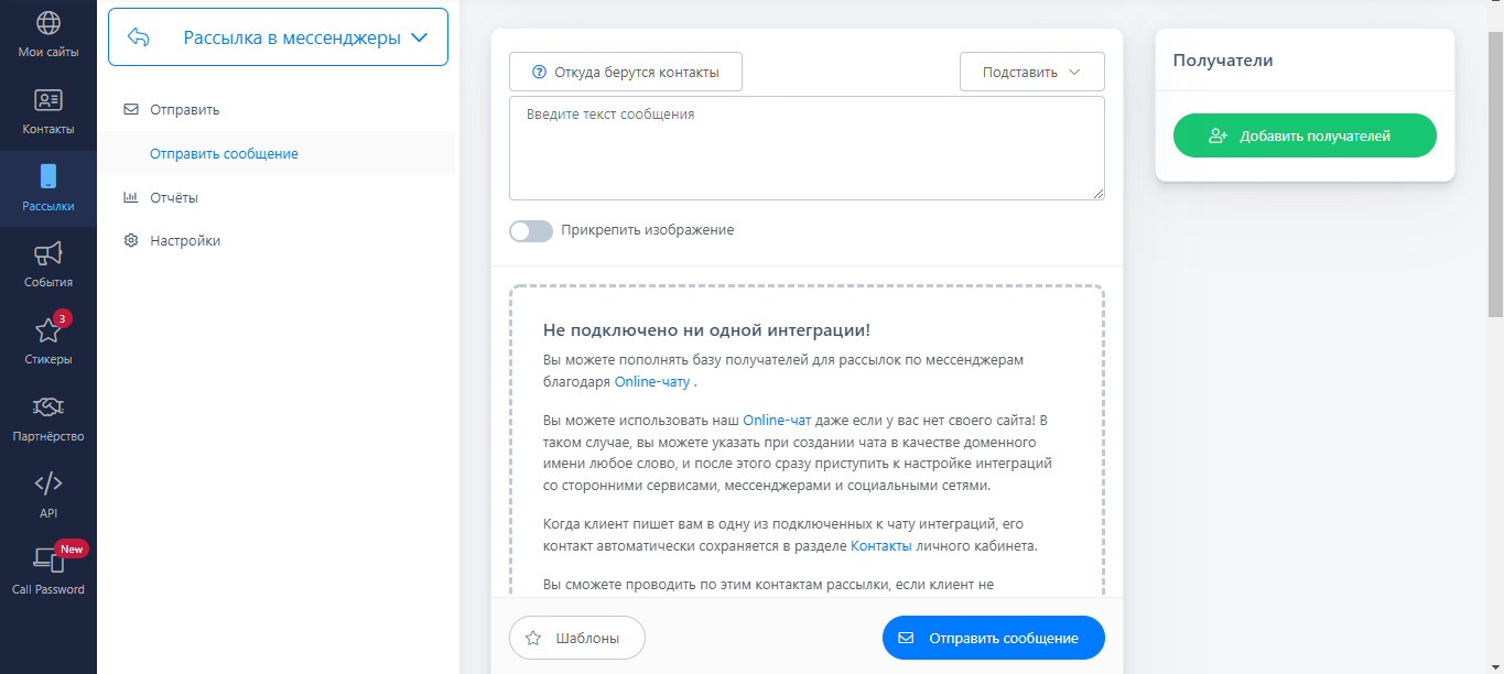 Если у вас не было подключено ни одной интеграции с мессенджерами, то и рассылку отправить вы не сможете. Первым делом подключите интеграцию.