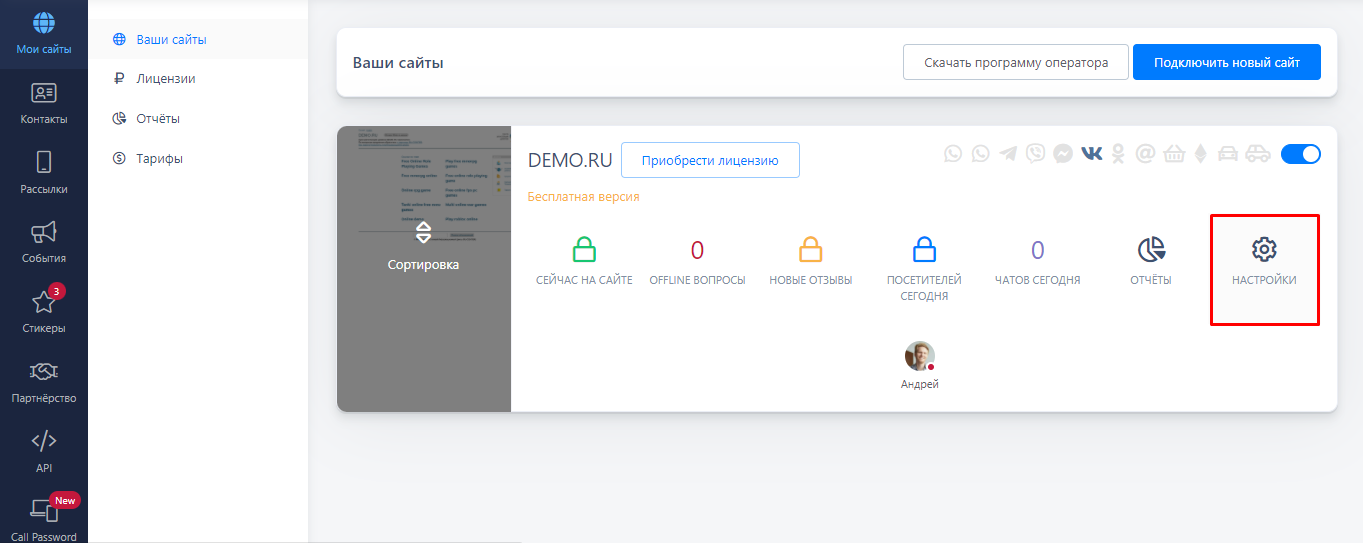 По умолчанию голосовые сообщения отключены. Чтобы их подключить, зайдите в ваш Личный кабинет и слева выберите "Мои сайты". В необходимом проекте кликните на "Настройки"..png)