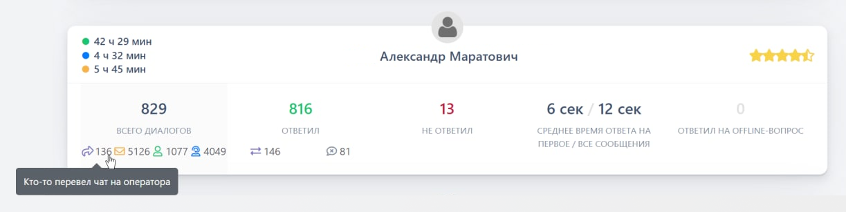 В отчётах по операторам добавлен показатель “Сколько чатов перевели на оператора”. Следить за продуктивностью операторов стало ещё проще! Нажав на стрелочку вы увидите все диалоги и какой оператор перевёл диалог.