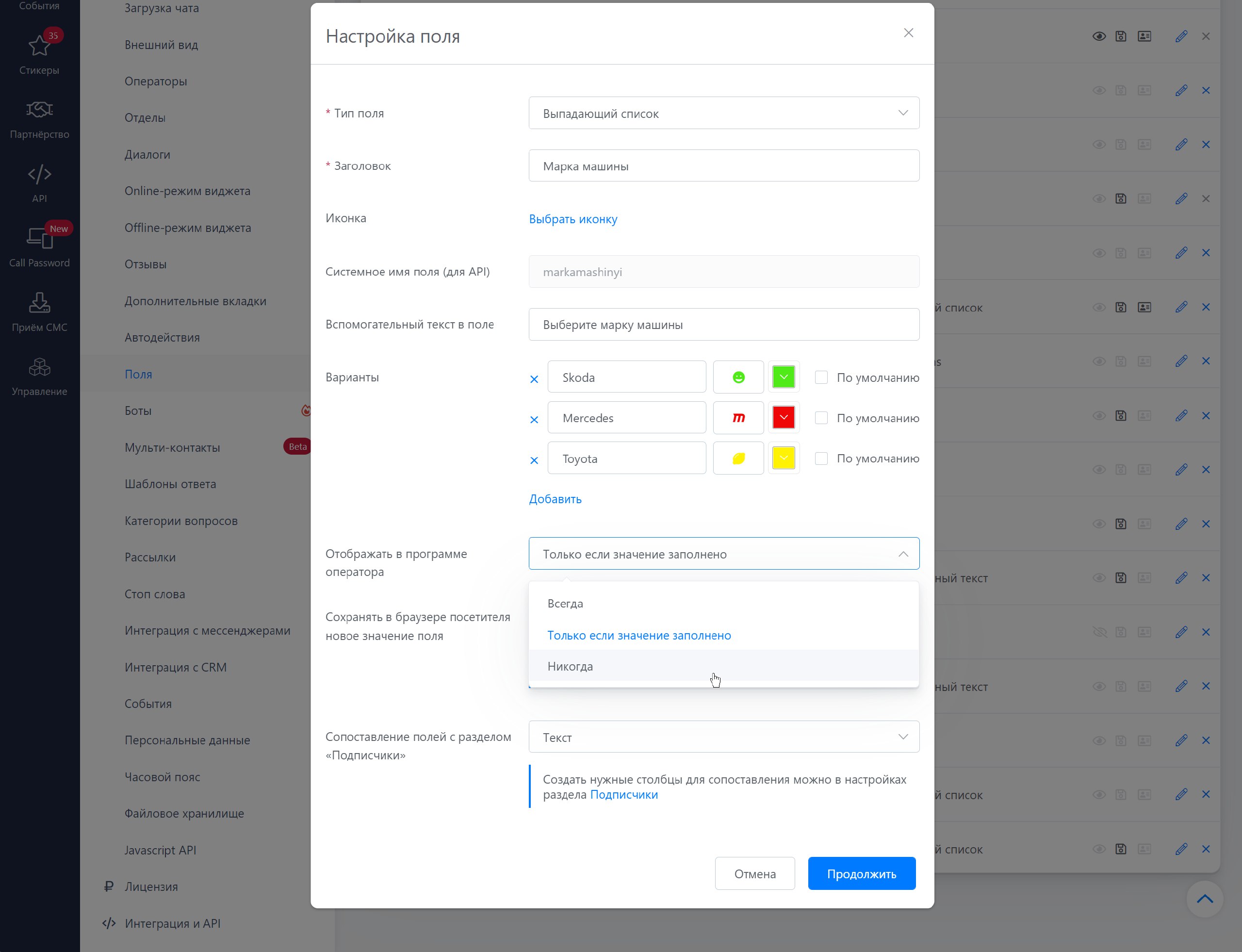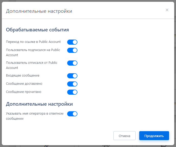 В “Дополнительных настройках” выберите ползунок “Указывать имя оператора в ответном сообщении”, нажмите на “Продолжить”.