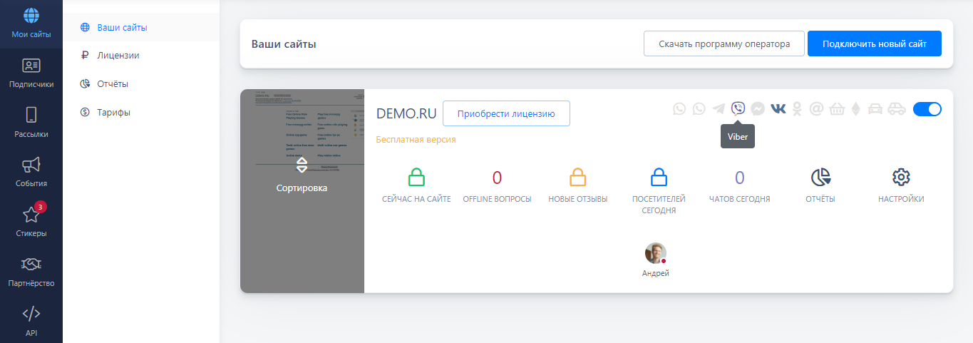 Для настройки зайдите в ваш Личный Кабинет. В разделе “Мои сайты” выберите необходимый вам сайт, и перейдите к настройке интеграции с Viber.