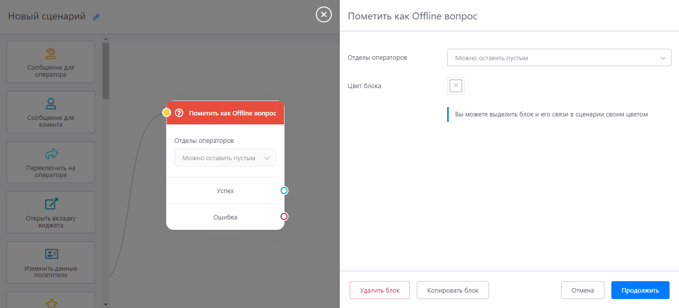 3. Выбор отдела в блоке "Пометить как Offline вопрос"