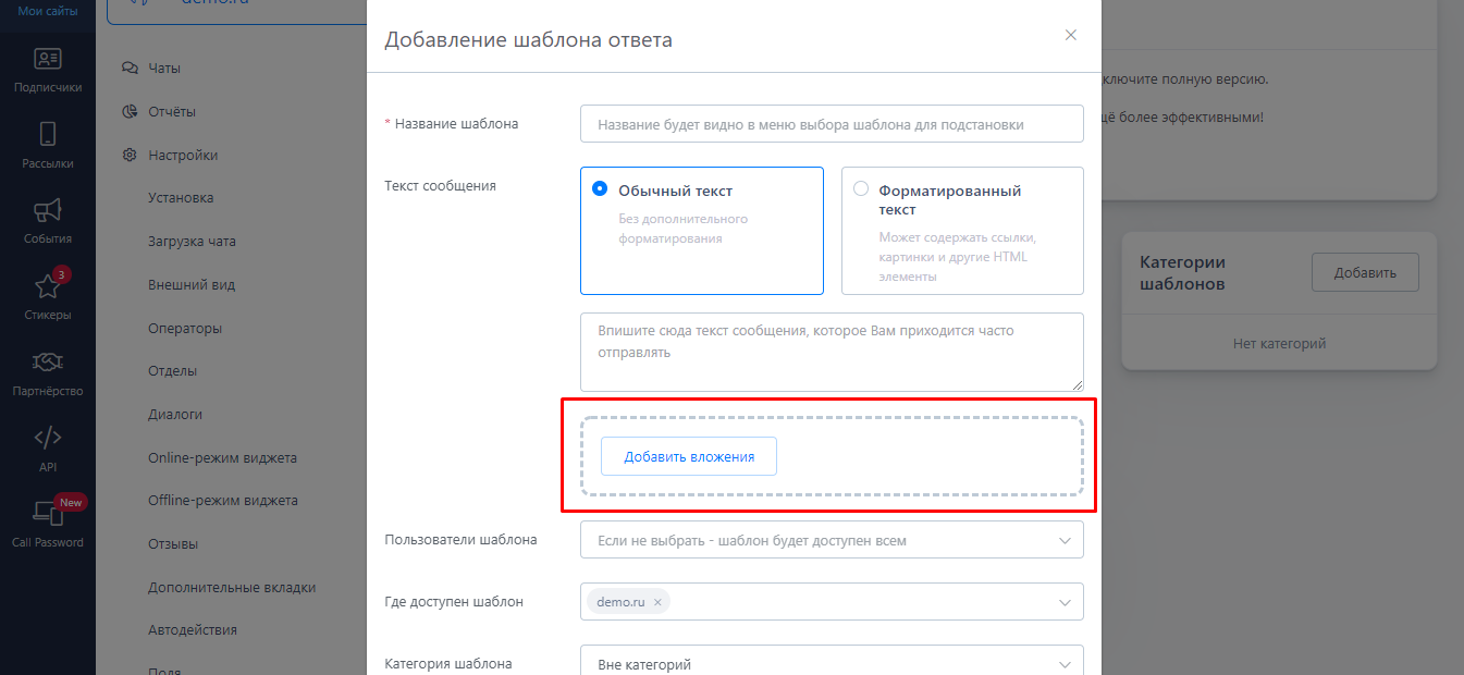 Для настройки зайдите в ваш Личный Кабинет, в разделе “Мои сайты” выберите необходимый вам сайт. Слева кликните на “Настройки - Шаблоны ответа”. При создании шаблона выберите поле “Добавить вложение”.