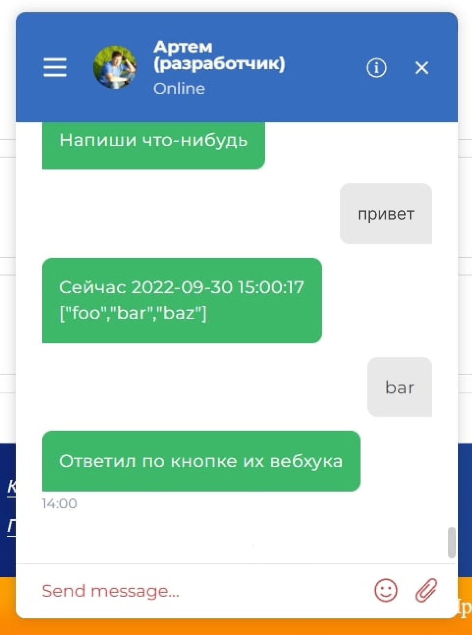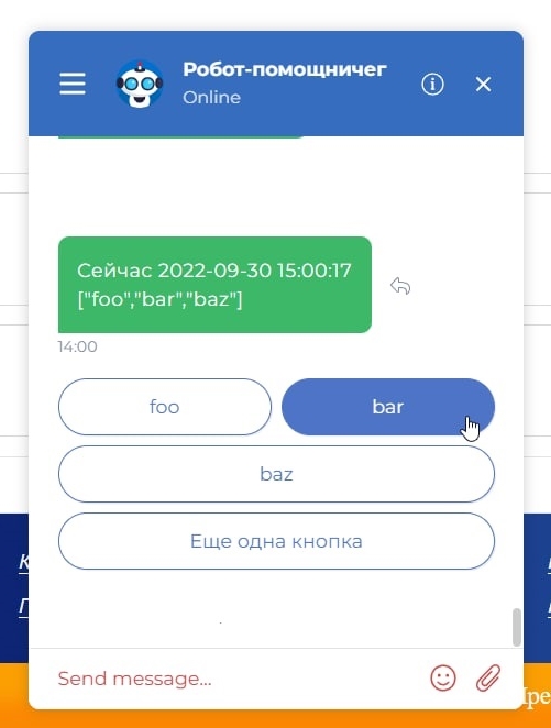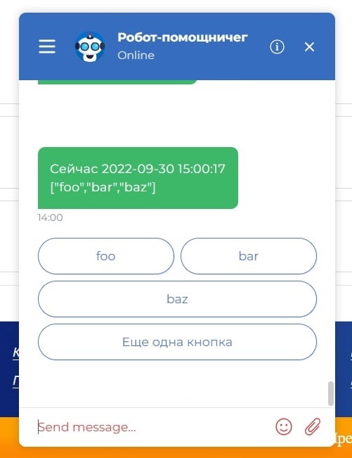 Бот отправляет такое сообщение в виджет чата на сайте. Ответ и кнопки берутся из ранее нами созданного Webhook.