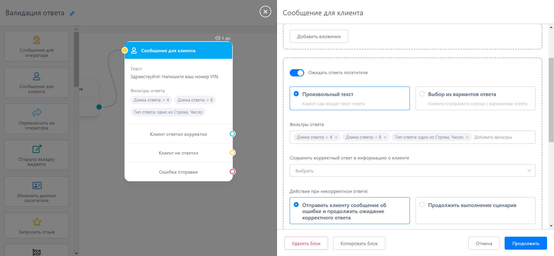 Мы заменили настройку валидации типа ответа (строка, число и т.д.) на фильтры. Теперь вы можете отфильтровать ответ клиента - по типу ответа, длине, количеству вложений и тексту ответа.