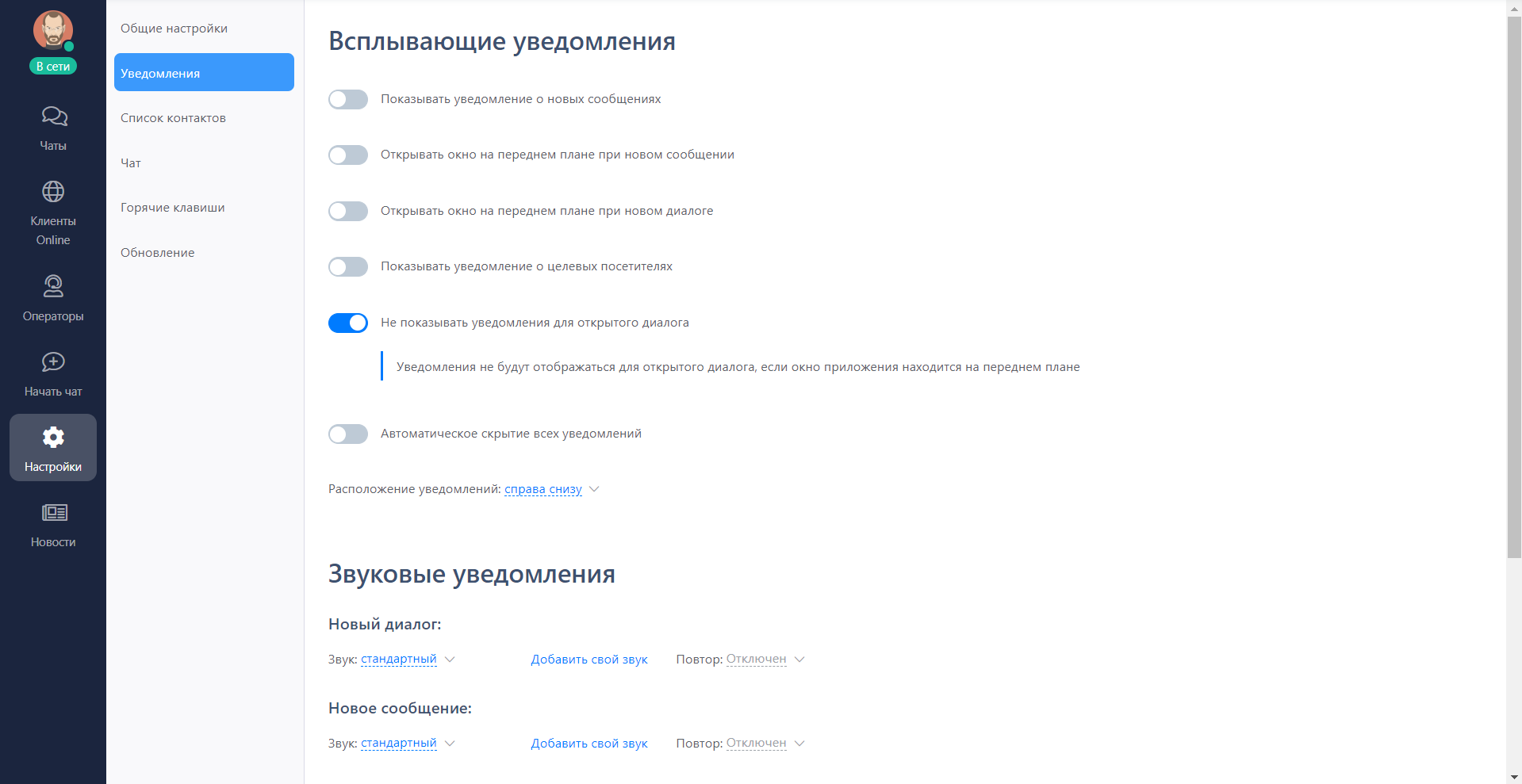 Если окно приложения программы оператора находится на переднем плане и вы его сейчас используете, то уведомления не будут отображаться. Теперь звук сообщения и всплывающие окна не будут отвлекать вас от диалога.