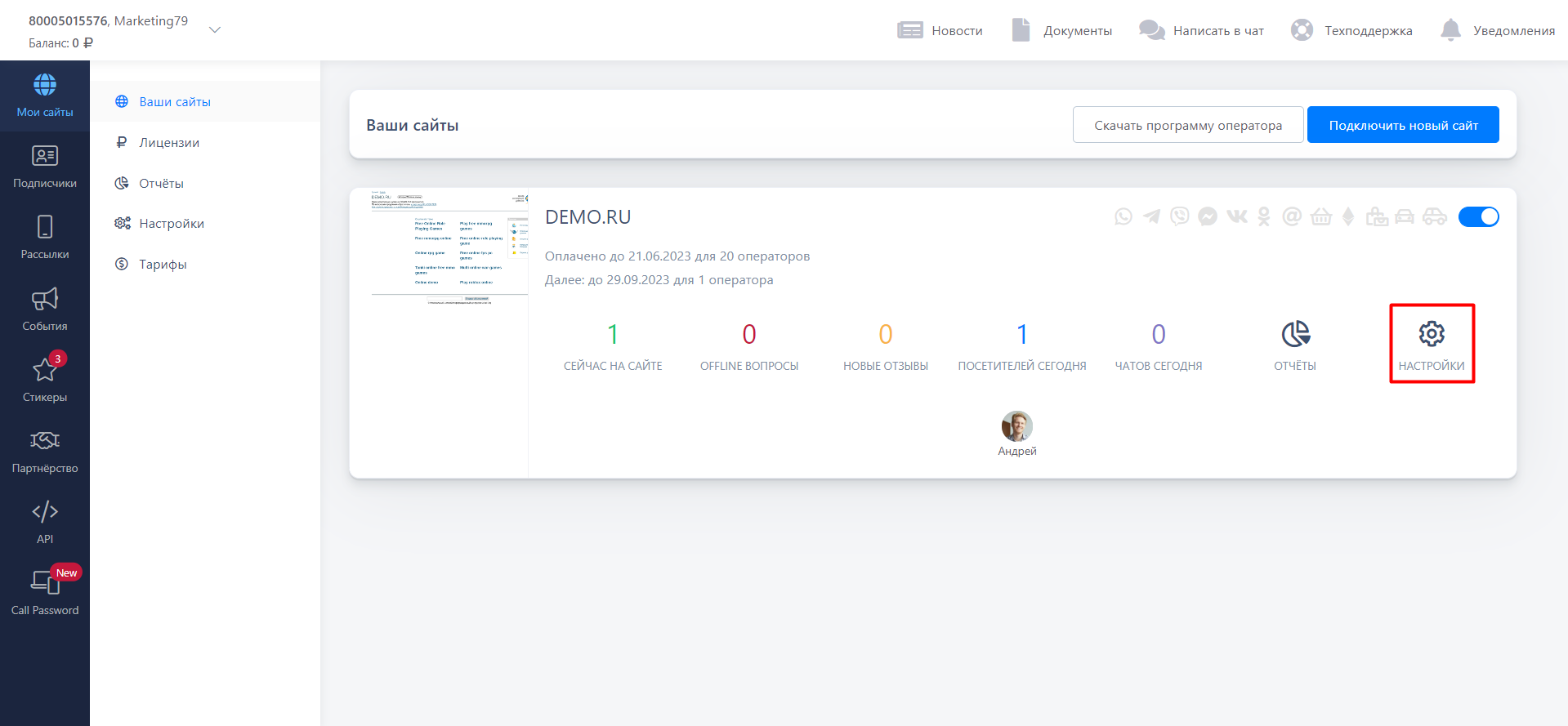 Чтобы подключить эту функцию, зайдите в ваш Личный кабинет и слева выберите "Мои сайты". В необходимом проекте кликните на "Настройки"..png)