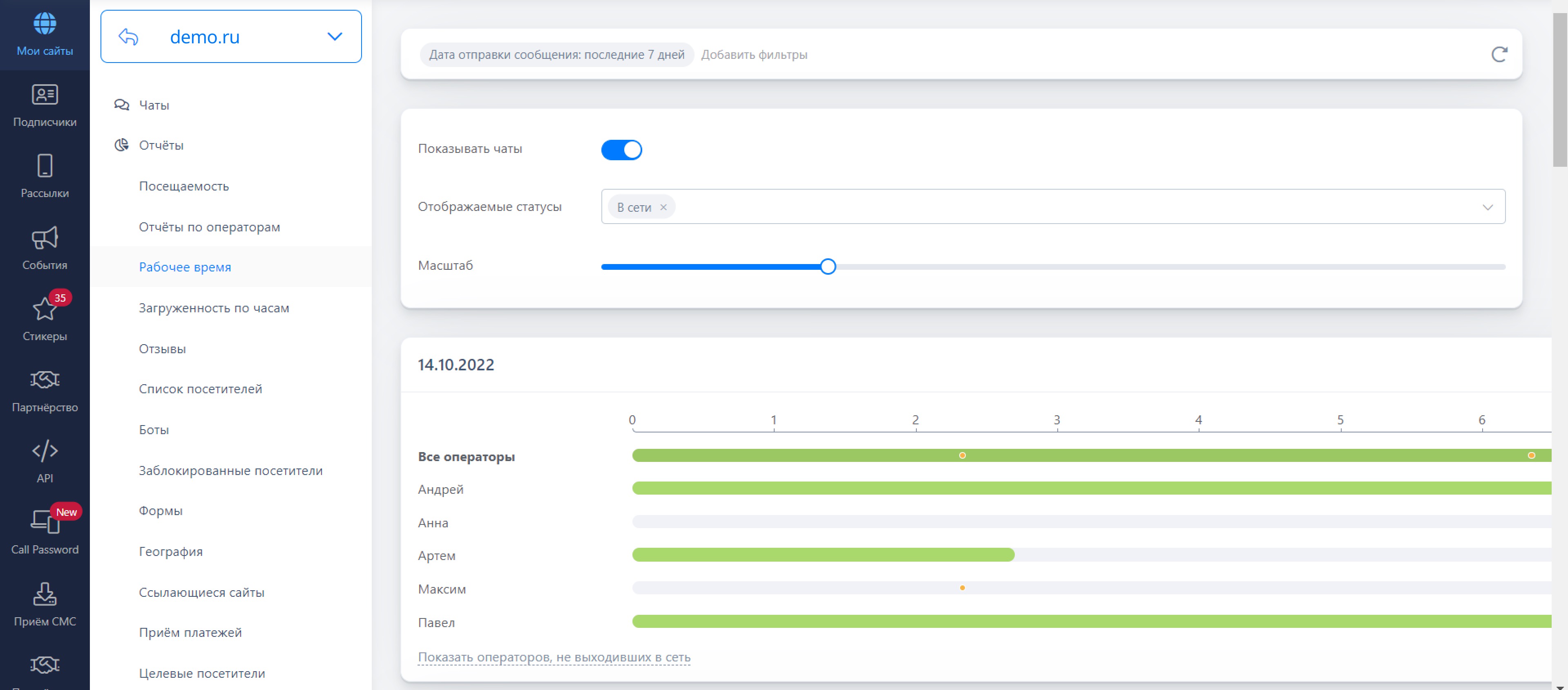 Теперь вы можете выбрать показывать чаты в отчёте или нет, выбрать статус оператора и масштаб отчёта для ещё большего удобства.