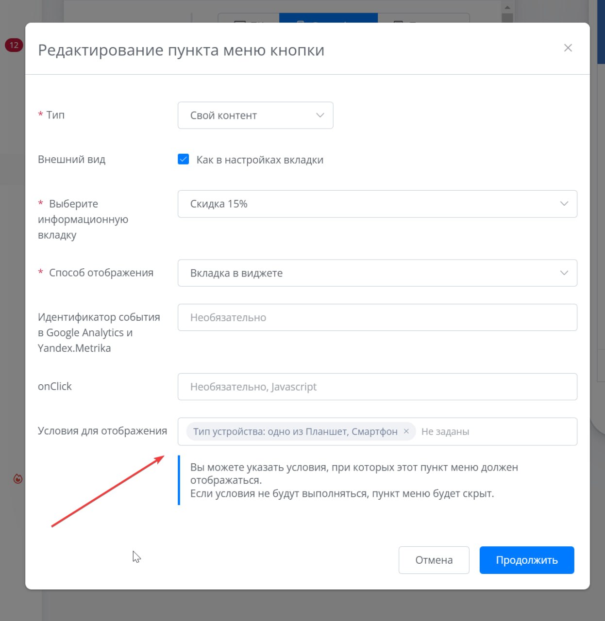 Кликните на нужный пункт меню и в “Условиях отображения” проставьте необходимые фильтры, нажмите на “Продолжить”.