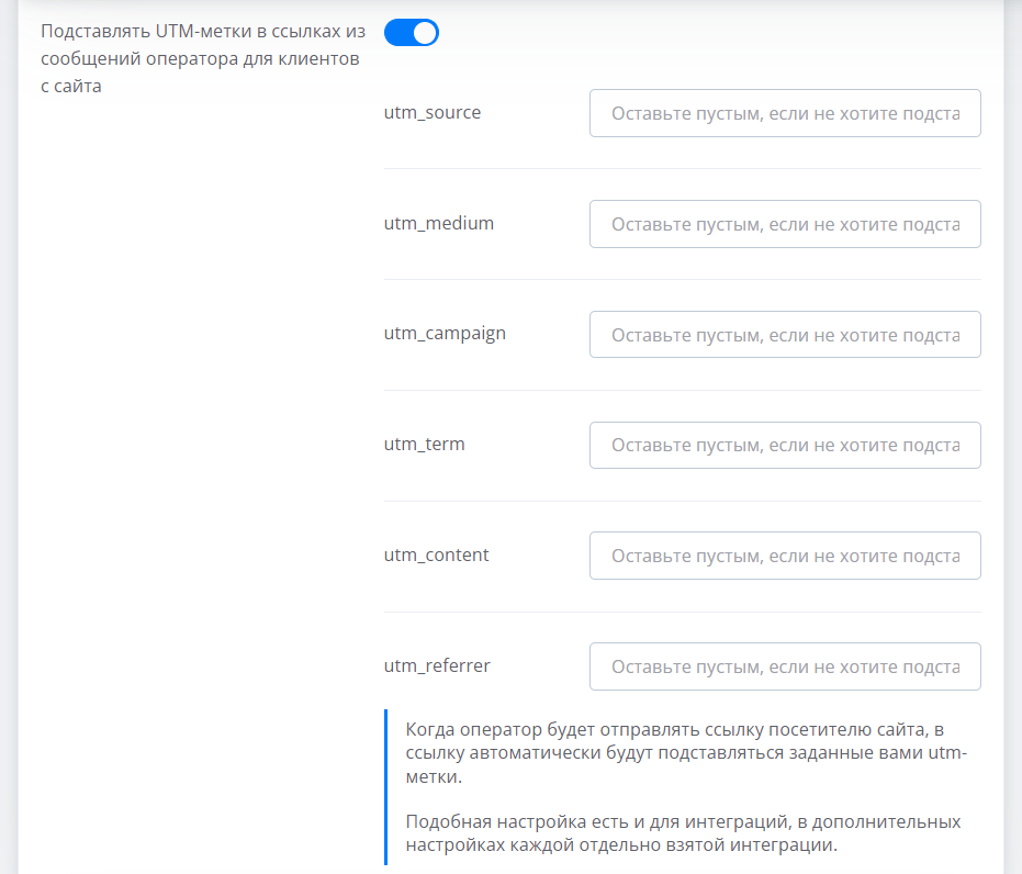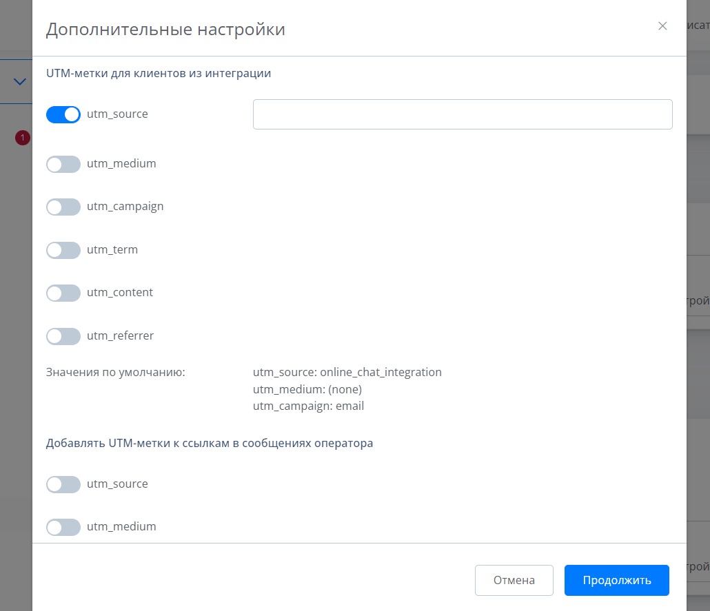Пролистайте в самый низ и нажмите на ползунок “Подставлять UTM-метки в ссылках из сообщений оператора для клиентов с сайта”. Пропишите нужные вам значения для UTM, нажмите на “Продолжить”..png)