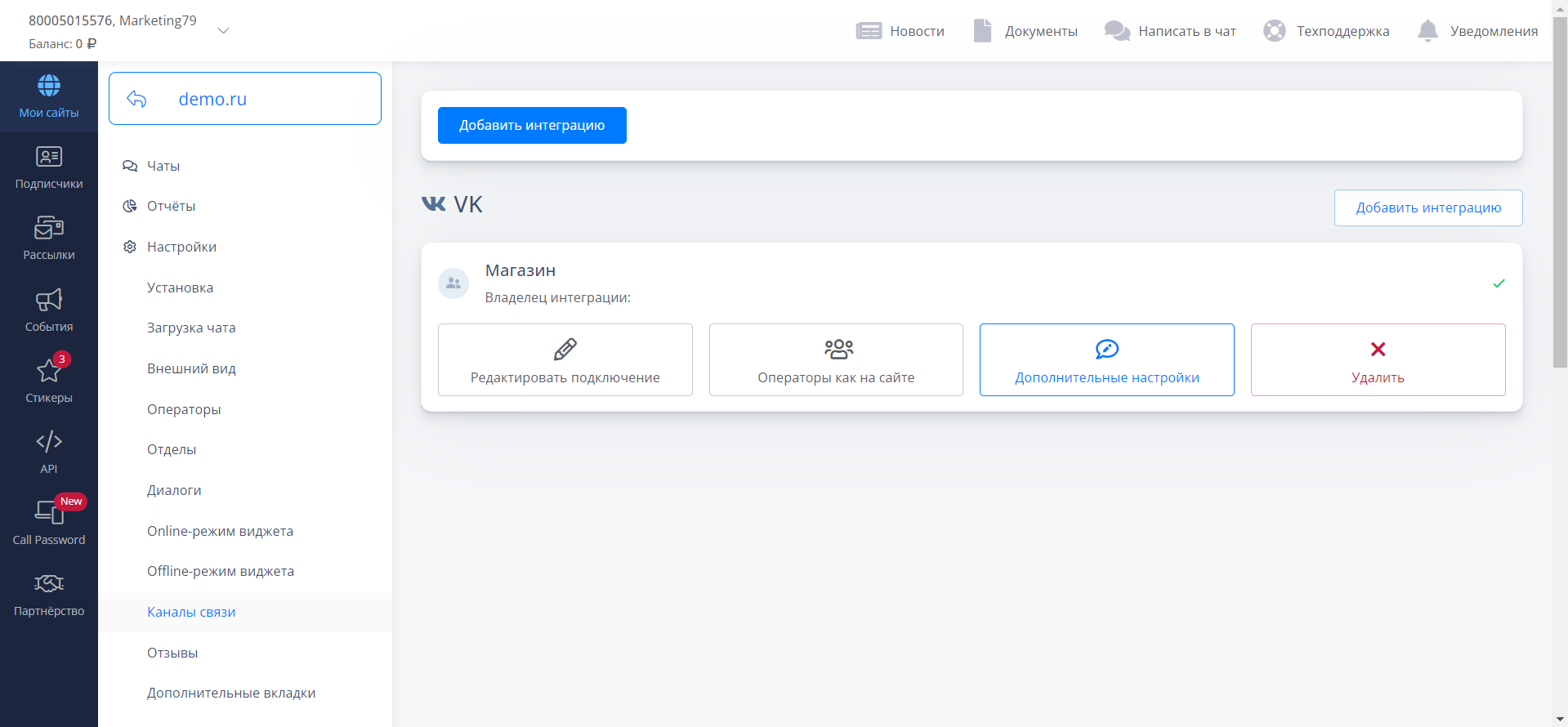 Выберите раздел “Каналы связи”. В нужной интеграции нажмите на “Дополнительные настройки”.