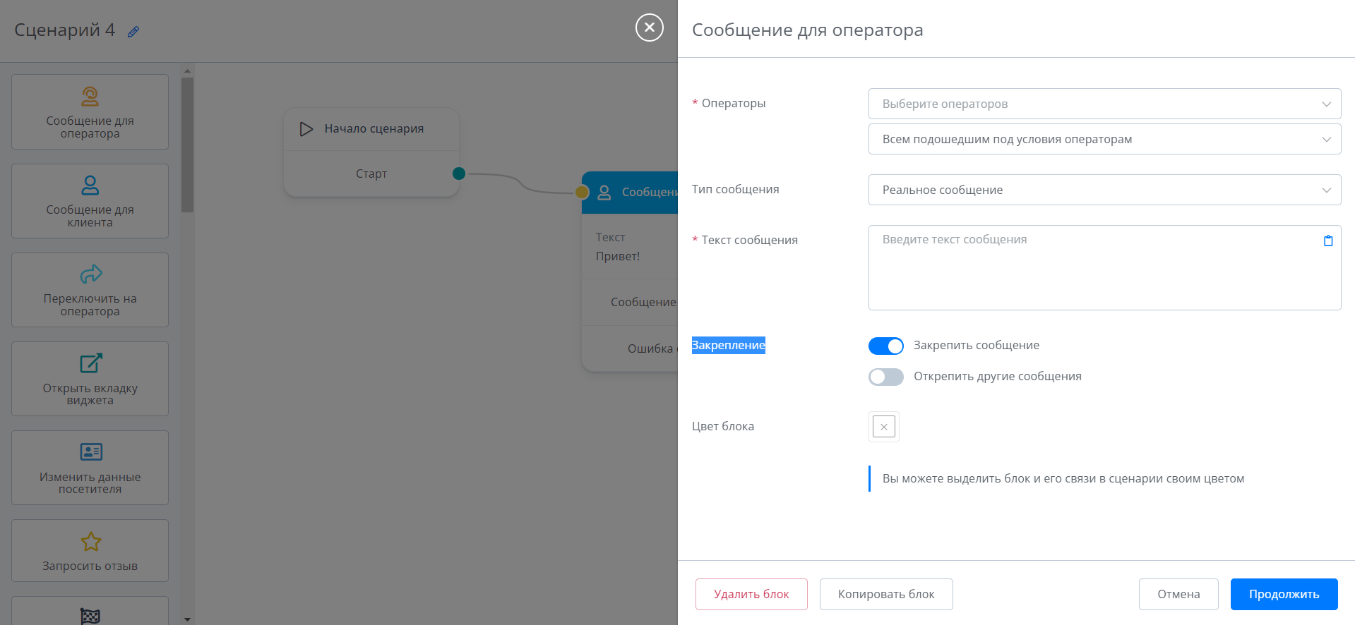 В ботах (и в событиях) в блок "Сообщение для оператора" добавили возможность закрепить сообщение для операторов. При этом есть возможность открепить все предыдущие сообщения. Или не откреплять, тогда закрепленное сообщение оператора добавится к ранее закрепленным.
