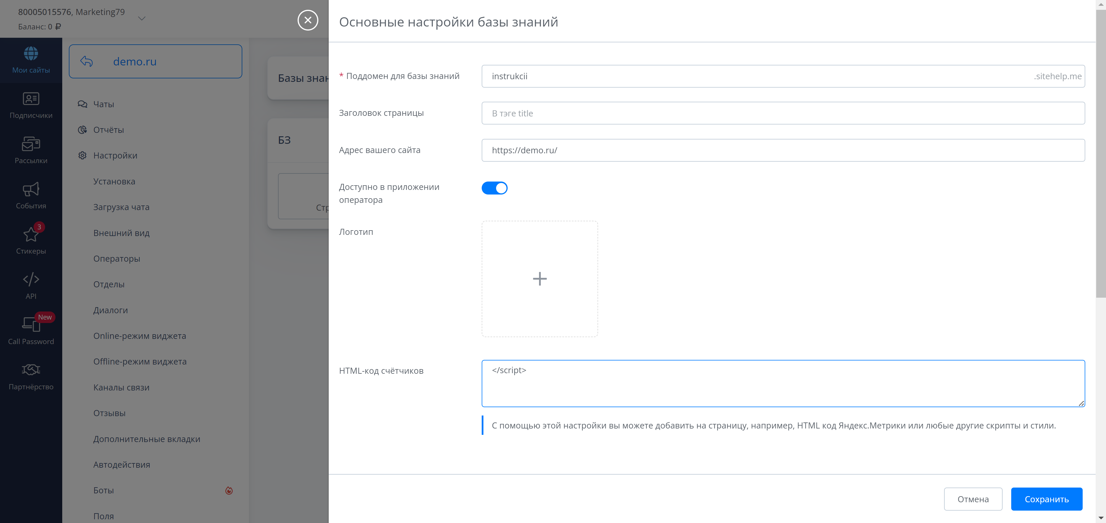 В настройках базы знаний появилась возможность разместить свой HTML-код. Например, для Яндекс Метрики.