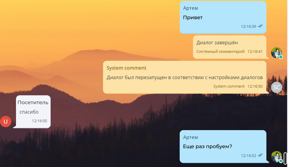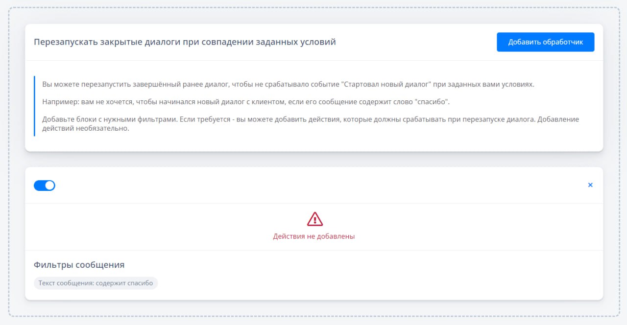 Выберите раздел “Диалоги”. Пролистайте в самый низ страницы до блока “Перезапускать закрытые диалоги при совпадении заданных условий”. Нажмите на “Добавить обработчик”.