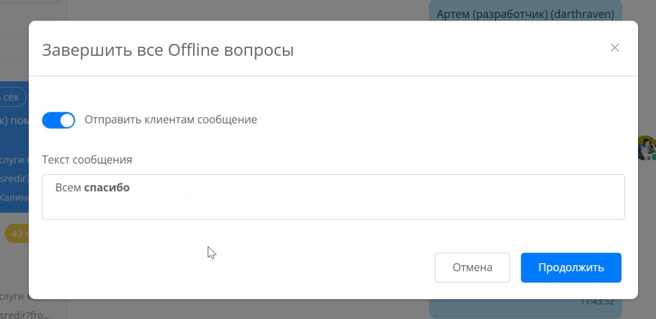 В программе оператора в массовом завершении оффлайн вопросов теперь можно опционально задать текст сообщения, который будет отправлен всем клиентам с оффлайн вопросом.