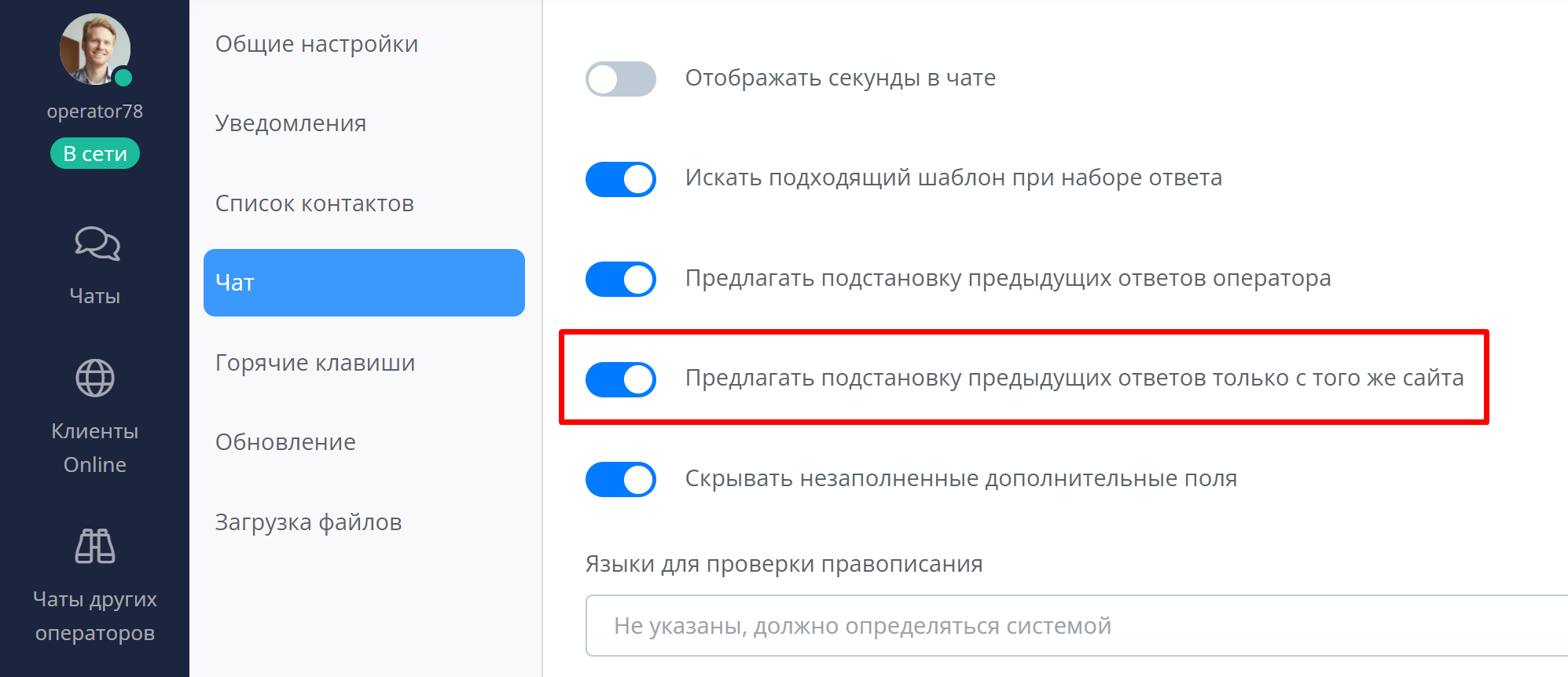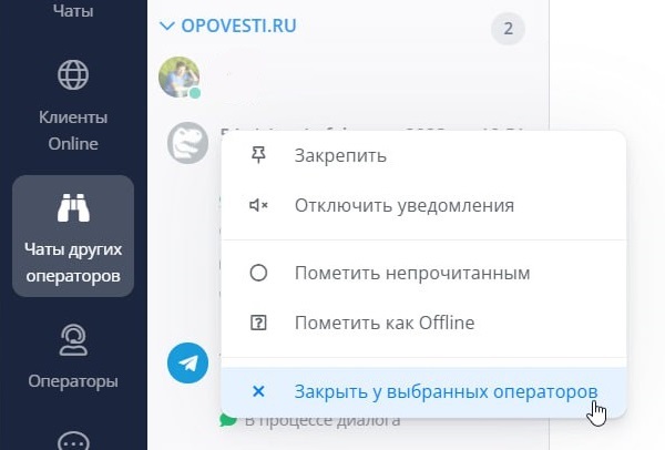 У операторов, с соответствующим правом доступа, появилась возможность закрывать чаты у других операторов через раздел "Чаты других операторов".