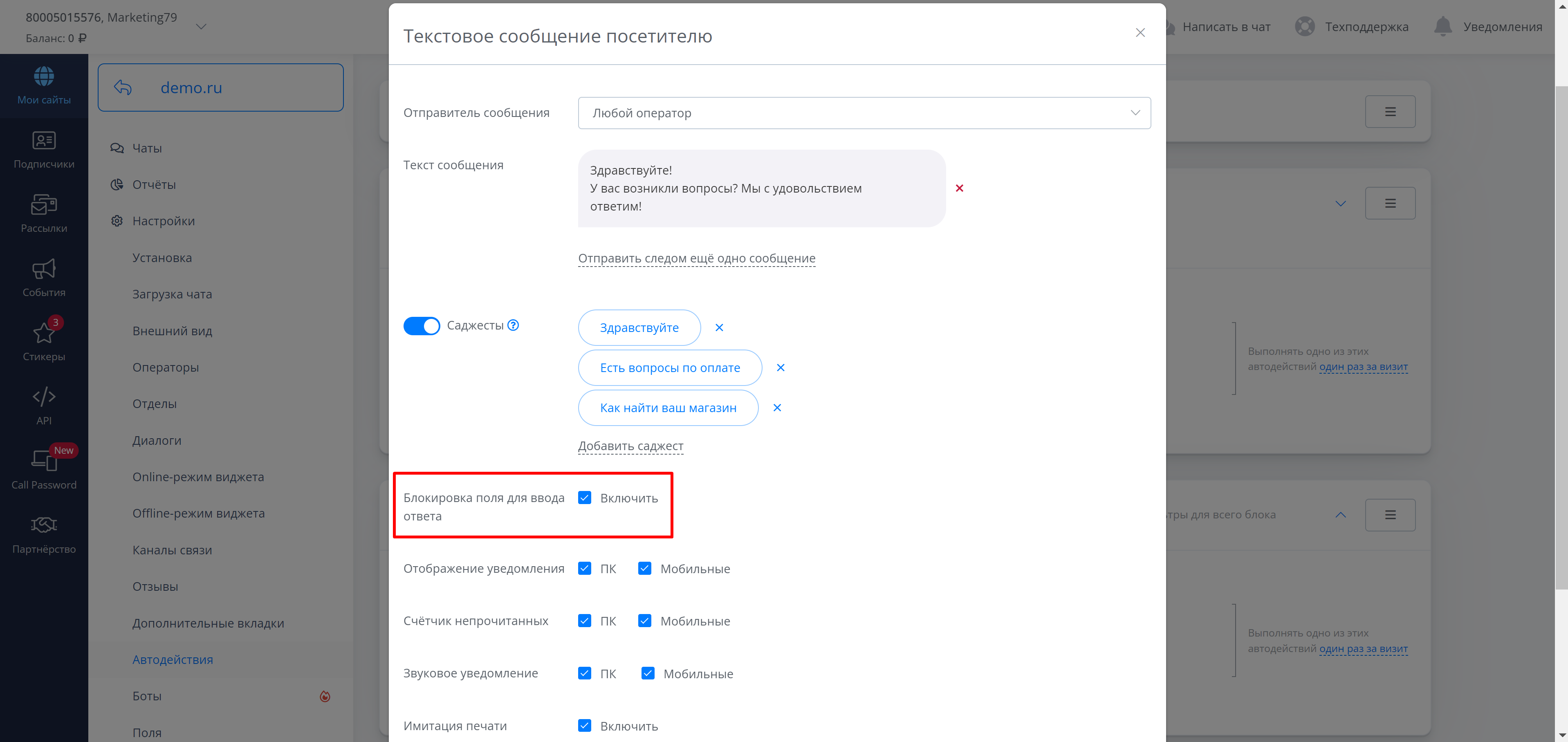 В настройках автодействия, при отправке сообщения с саджестами, появилась возможность блокировать поле для ввода сообщения.