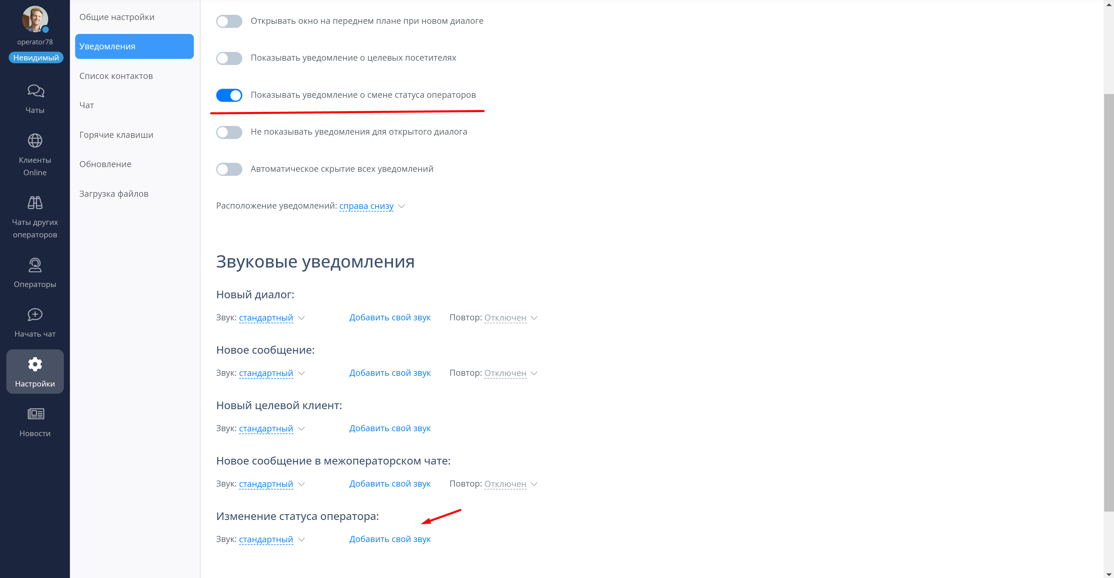 - статус операторов в момент отправки сообщения, это может быть полезно, если нужно разобраться почему кто-то из операторов не получил сообщение.