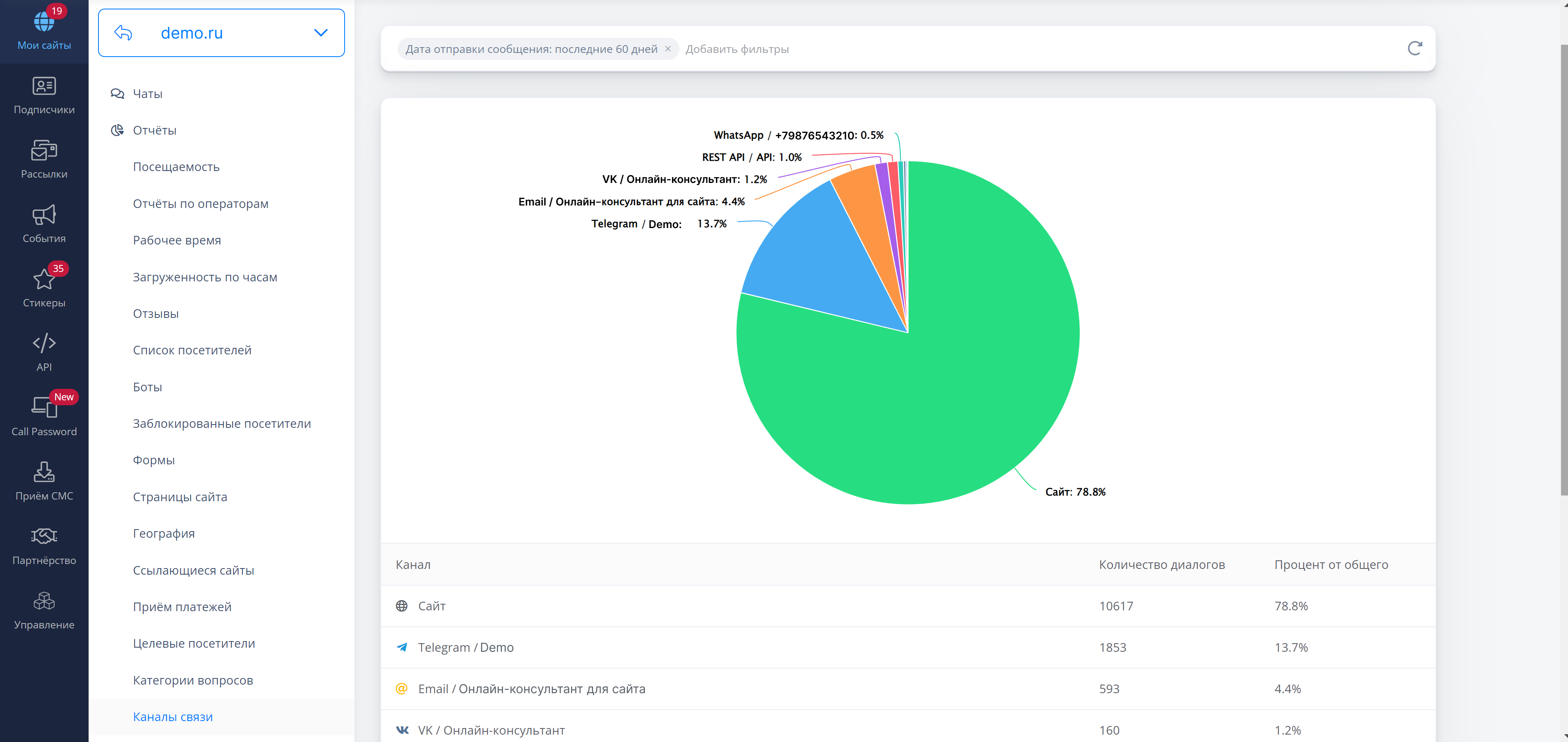 С помощью отчёта "Каналы связи" вы можете быстро определить с какого канала поступает наибольшее количество диалогов как в количественном, так и в процентном соотношении.
