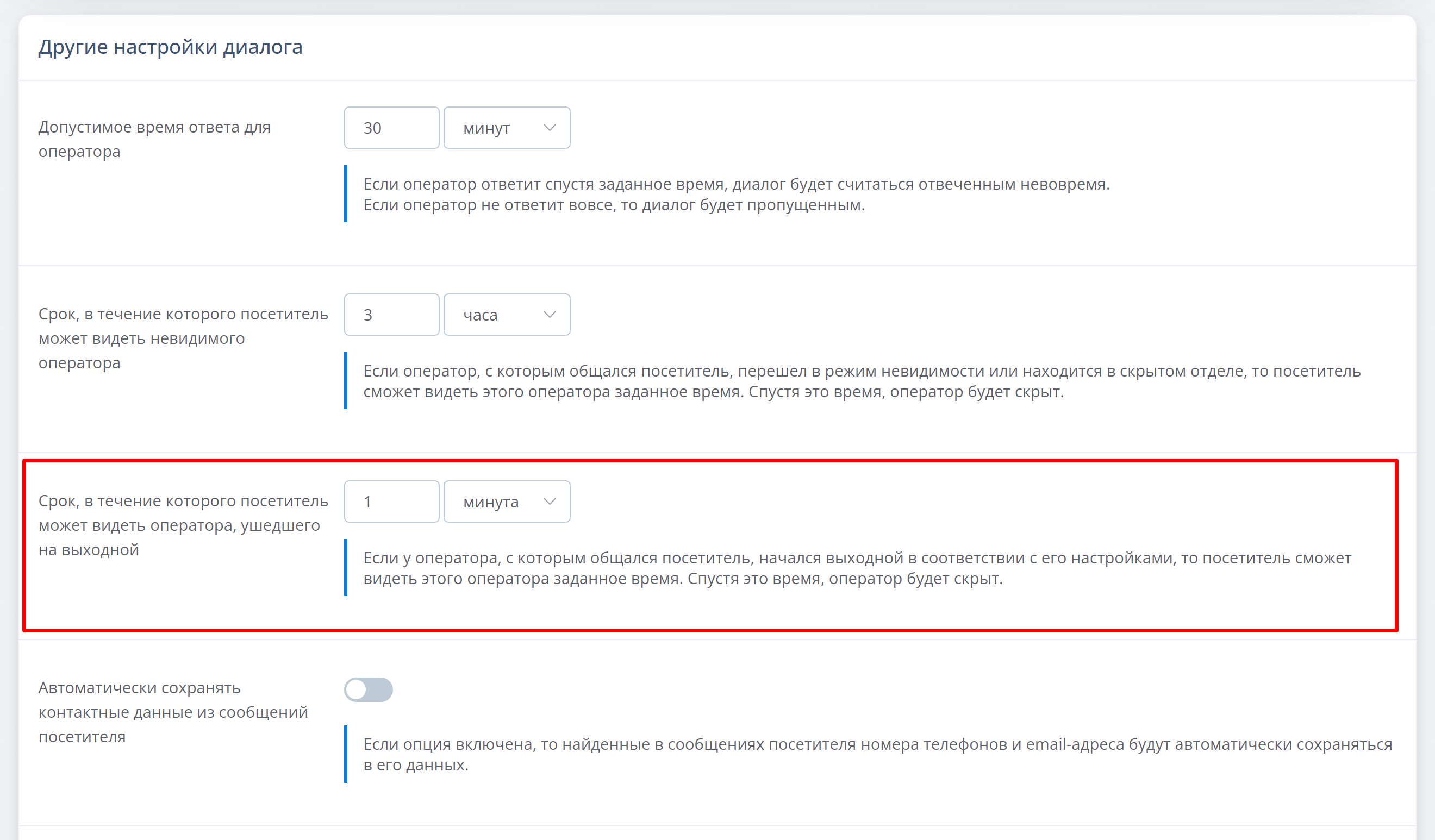 Найдите пункт “Срок, в течение которого посетитель может видеть оператора, ушедшего на выходной”. Укажите спустя какое время оператор будет скрыт..png)