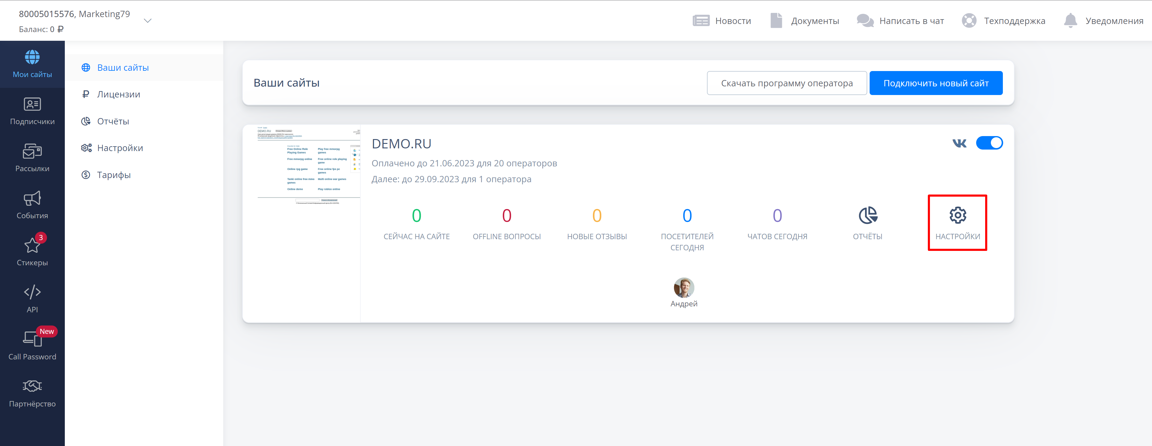 Чтобы подключить эту функцию, зайдите в ваш личный кабинет и слева выберите "Мои сайты". В необходимом проекте кликните на "Настройки"..png)