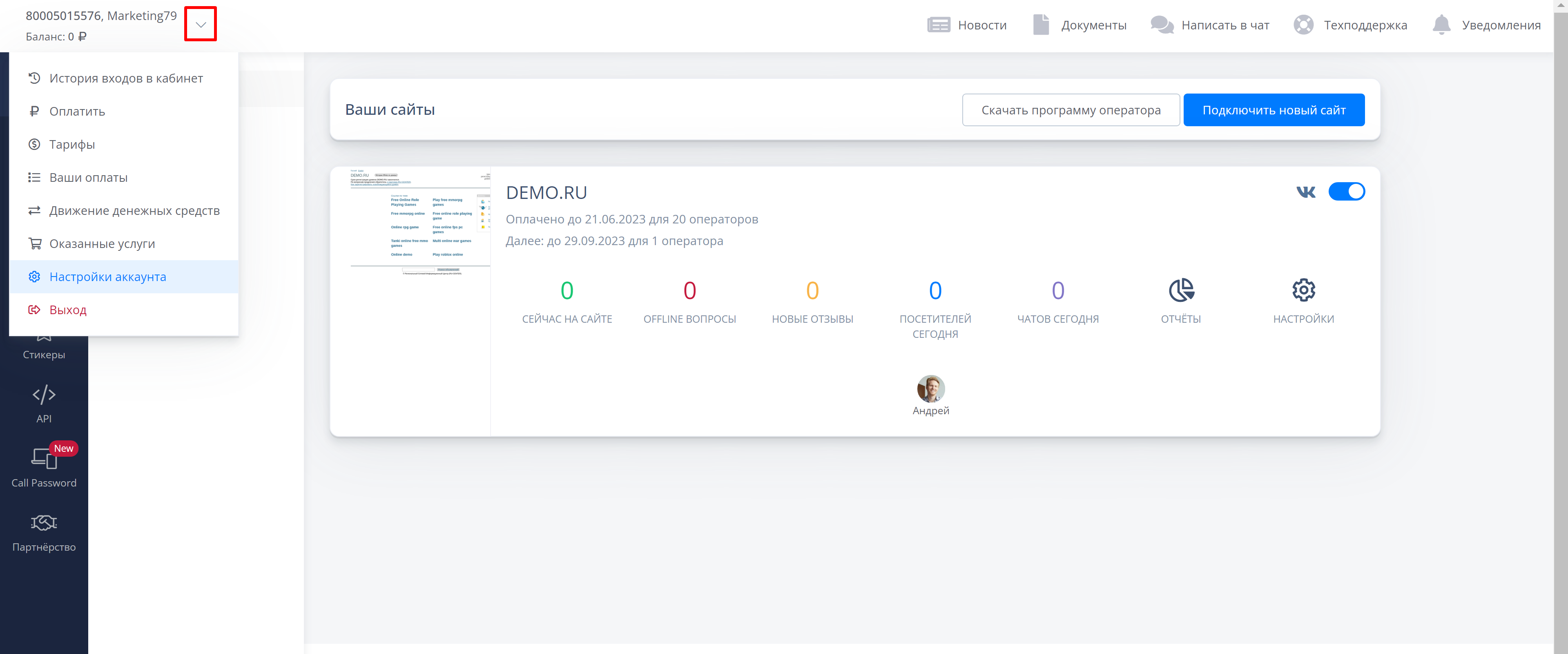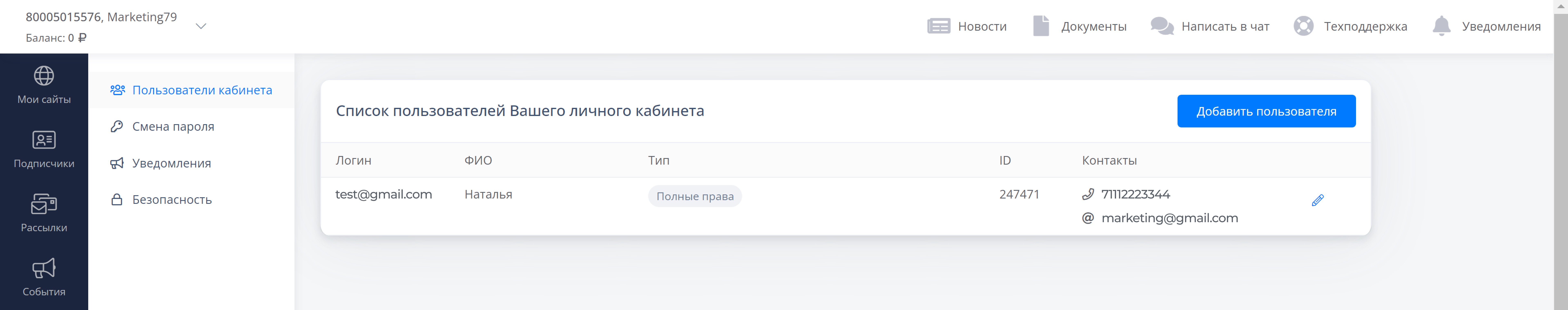 Для настройки кликните на “галочку” возле вашего номера лицевого счёта “8000”. Нажмите на “Настройки аккаунта” - “Пользователи кабинета”.