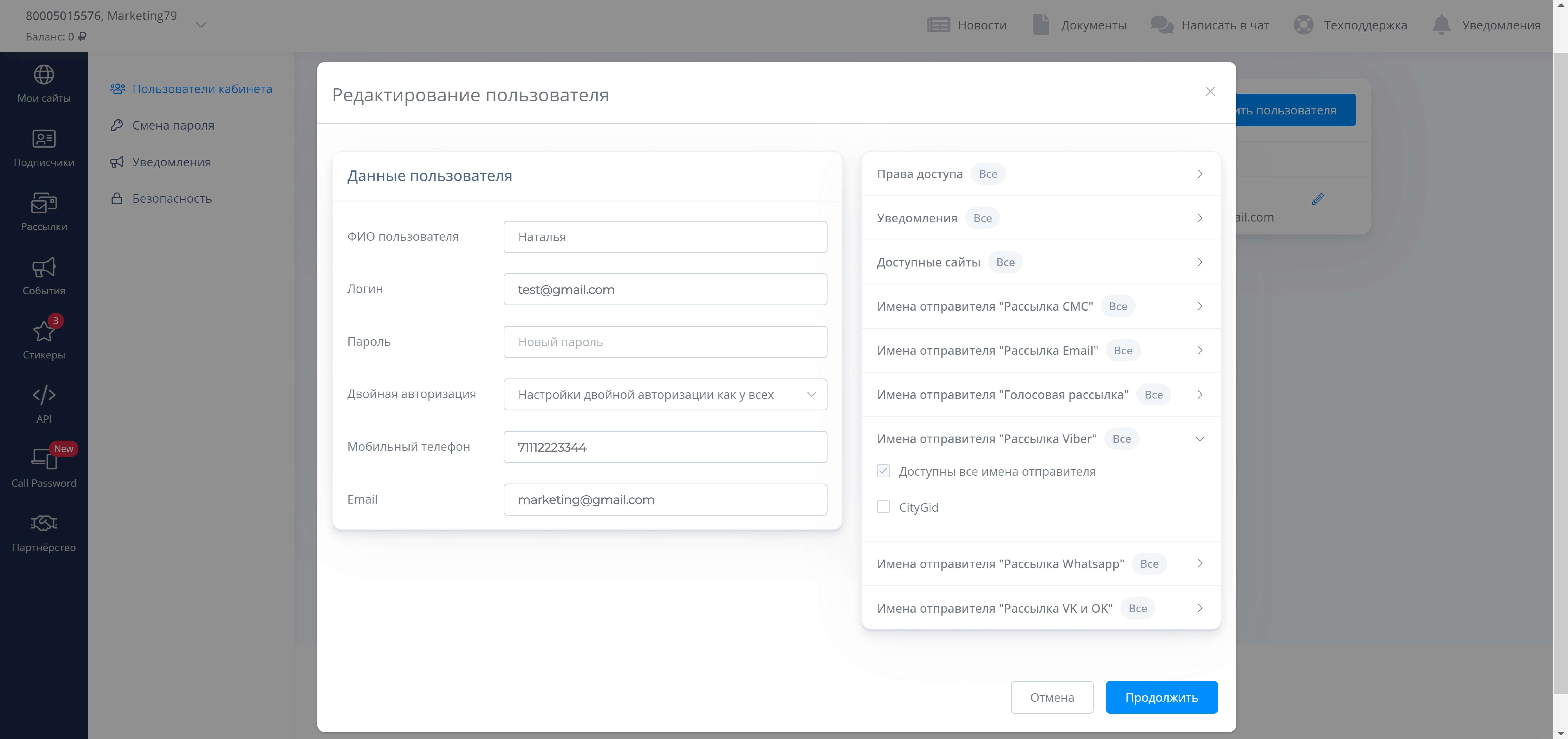 В настройках пользователя личного кабинета теперь можно выбрать список доступных ему имен отправителя для всех рассылок в нашем Личном кабинете: СМС, WhatsApp, Viber, Голосовые, Вконтакте и Одноклассниках.