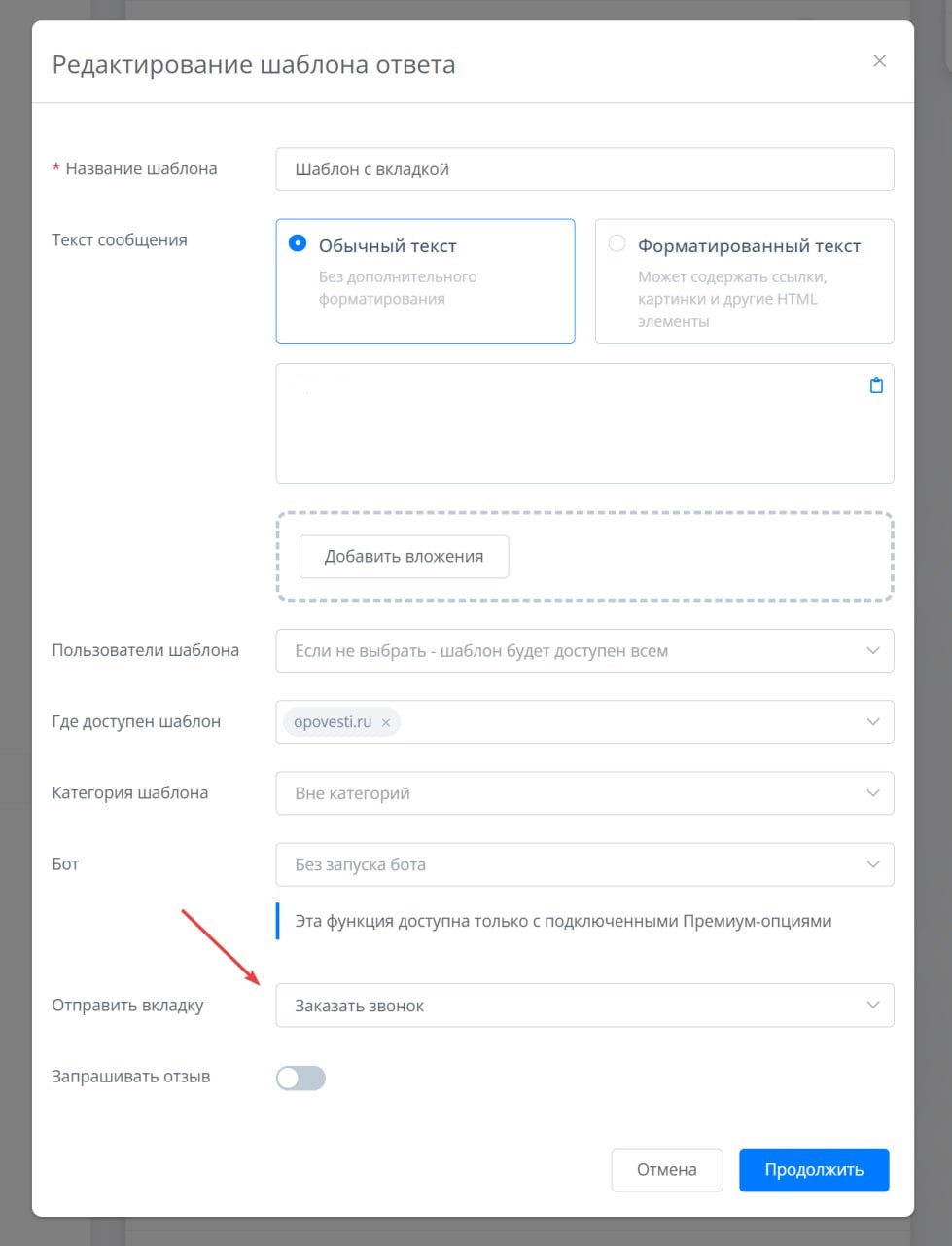 В настройках шаблонов сообщений операторов появилась возможность отправки дополнительной вкладки после шаблонного сообщения.