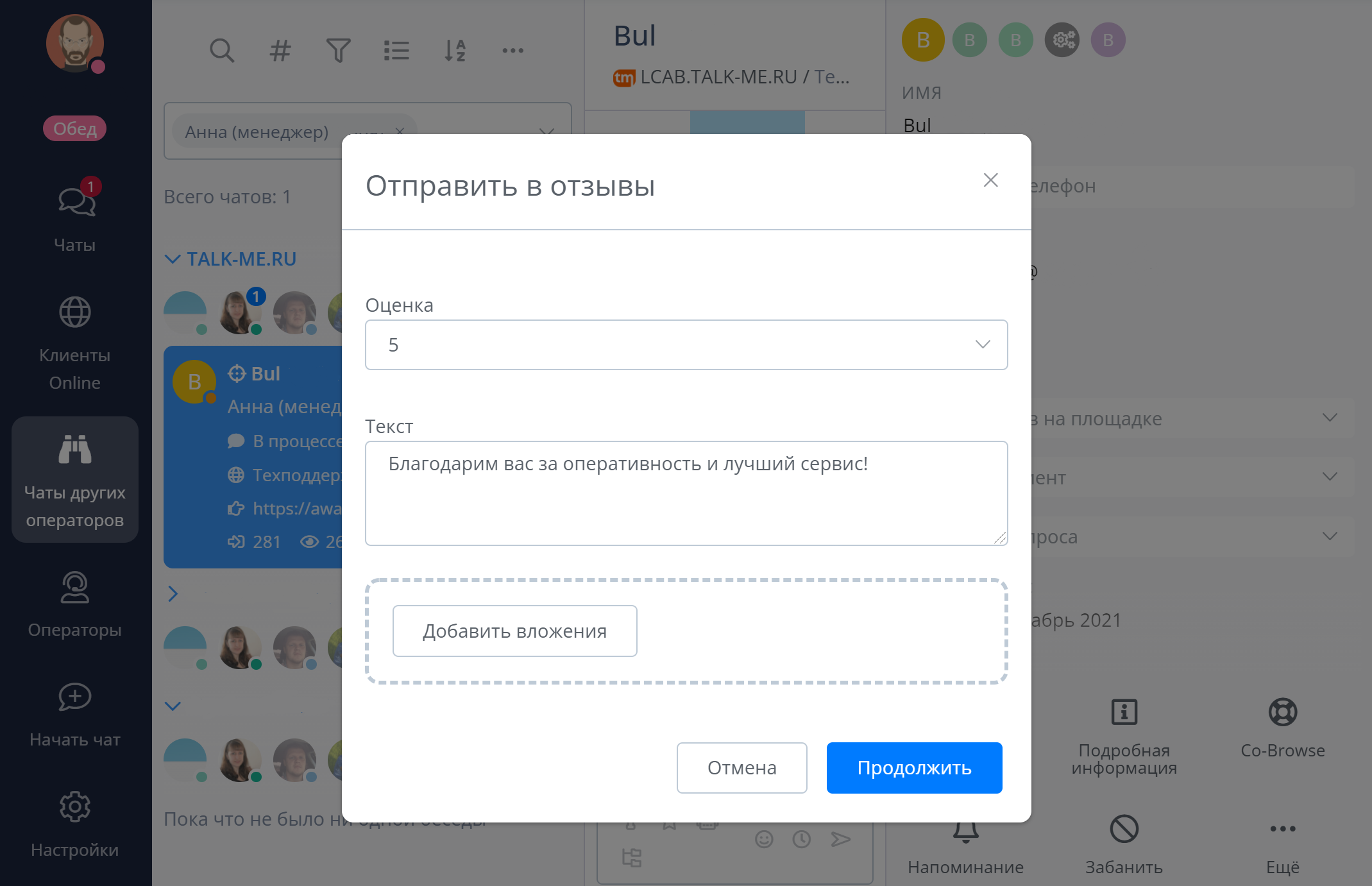 У операторов появится новое право доступа "Может отправлять отзыв от имени клиента". Вы можете отключить у оператора право доступа к отправке отзыва от имени клиента, но изначально эта возможность включена у всех операторов.