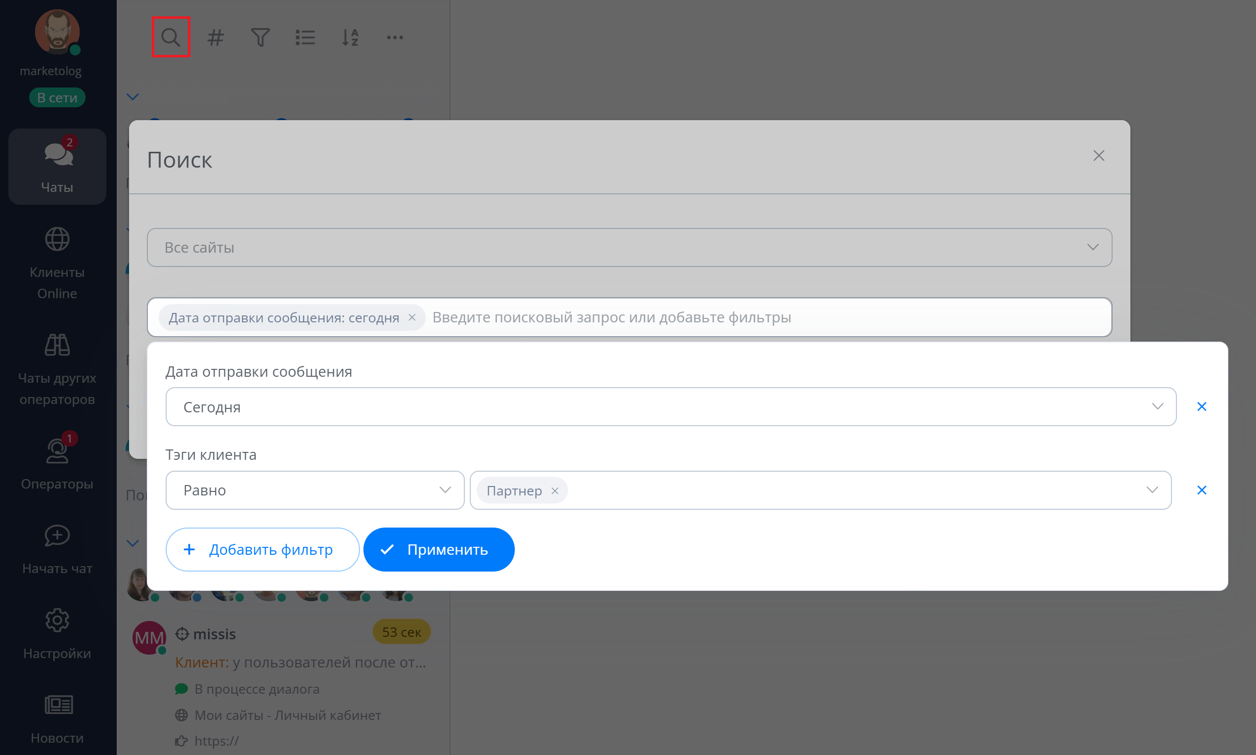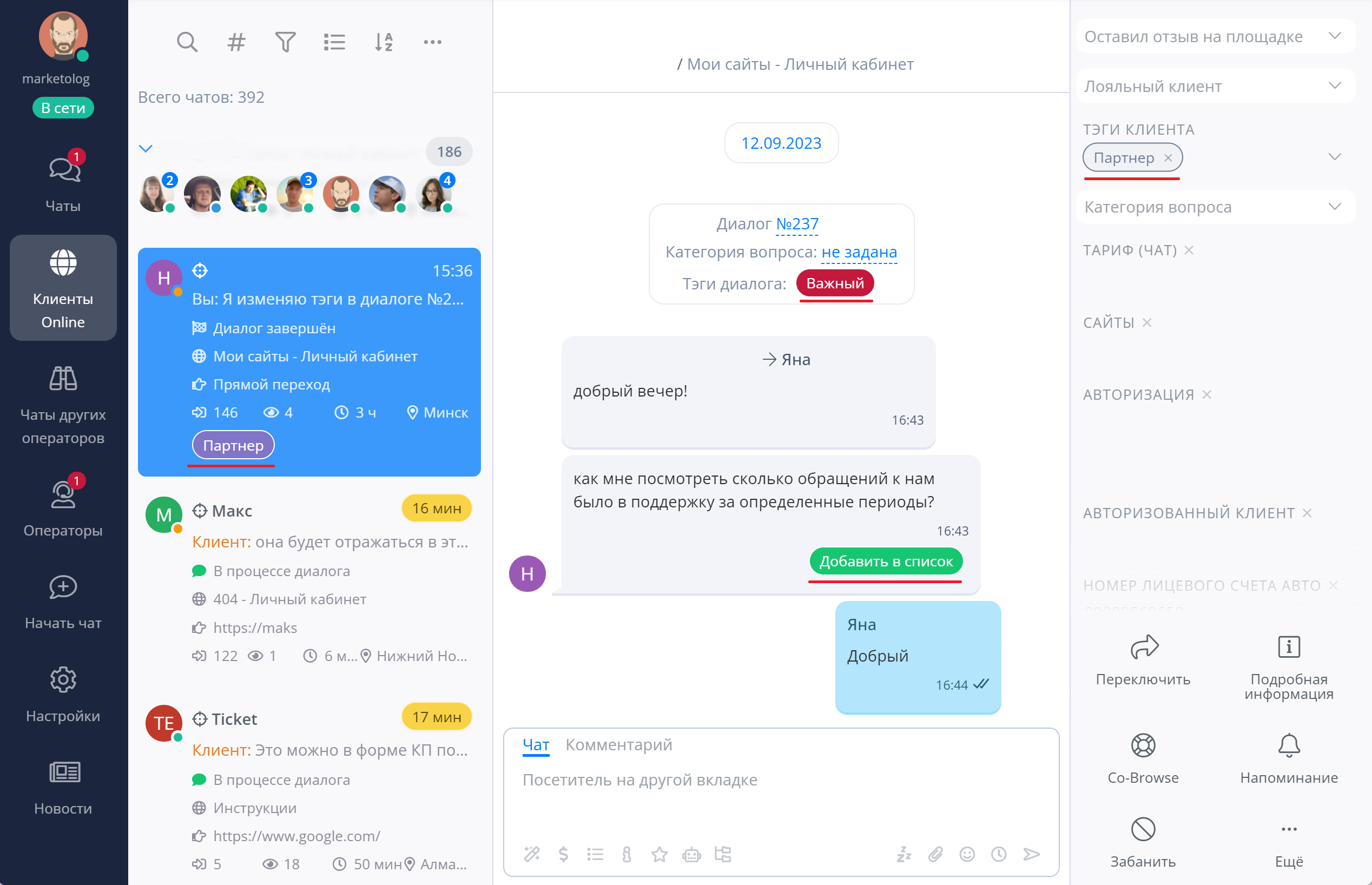 Тэги пригодятся при анализе диалогов – сделайте выгрузку клиентов с определенным тэгом в несколько кликов и изучайте детали переписки.
