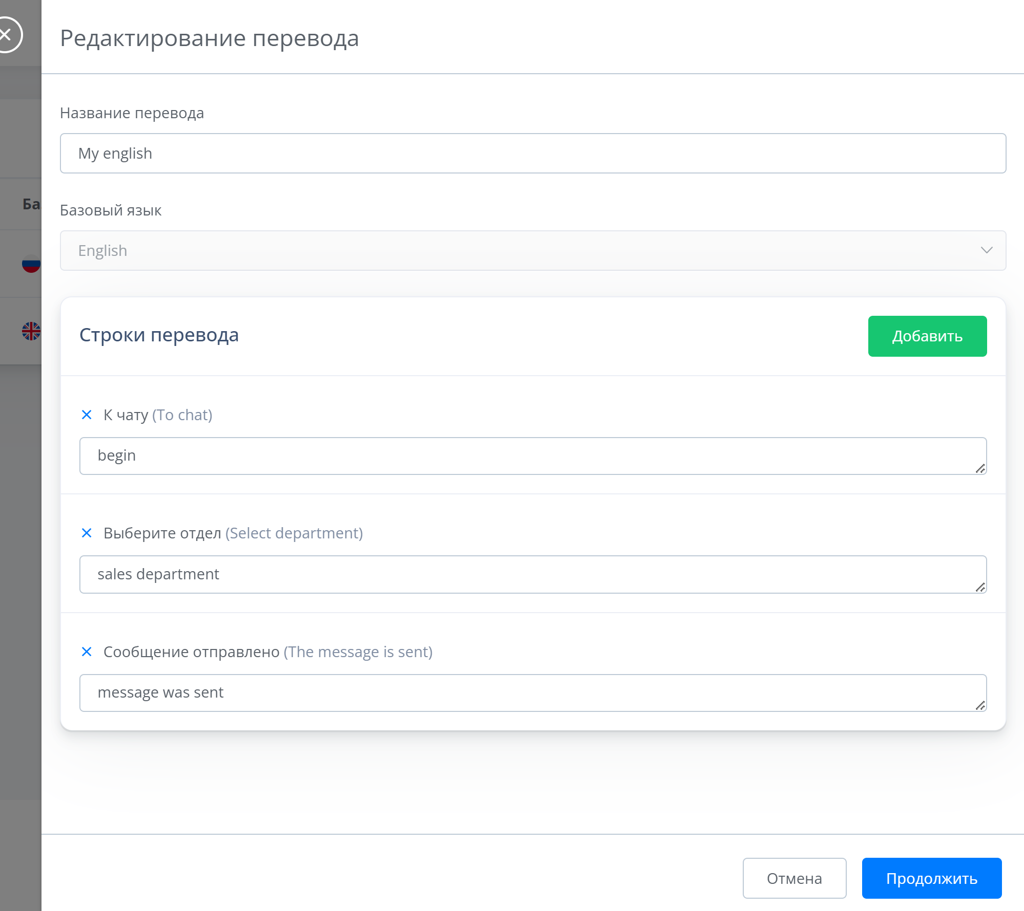 Выберите перевод для нужного элемента виджета - названия отдела операторов, подзаголовков, кнопкок и остального. После редатирования нажмите на "Продолжить"..png)