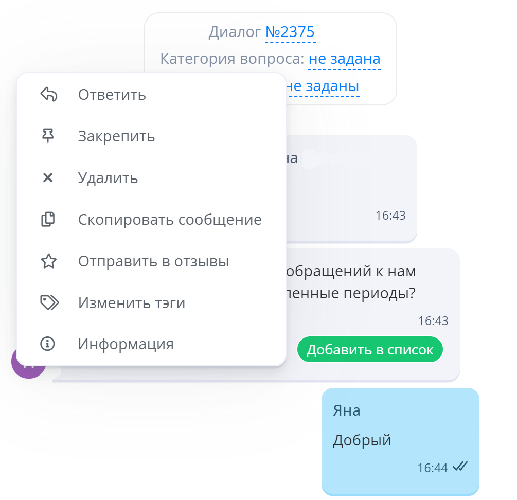Теперь вы можете проставить тэги клиенту, диалогу или сообщению.