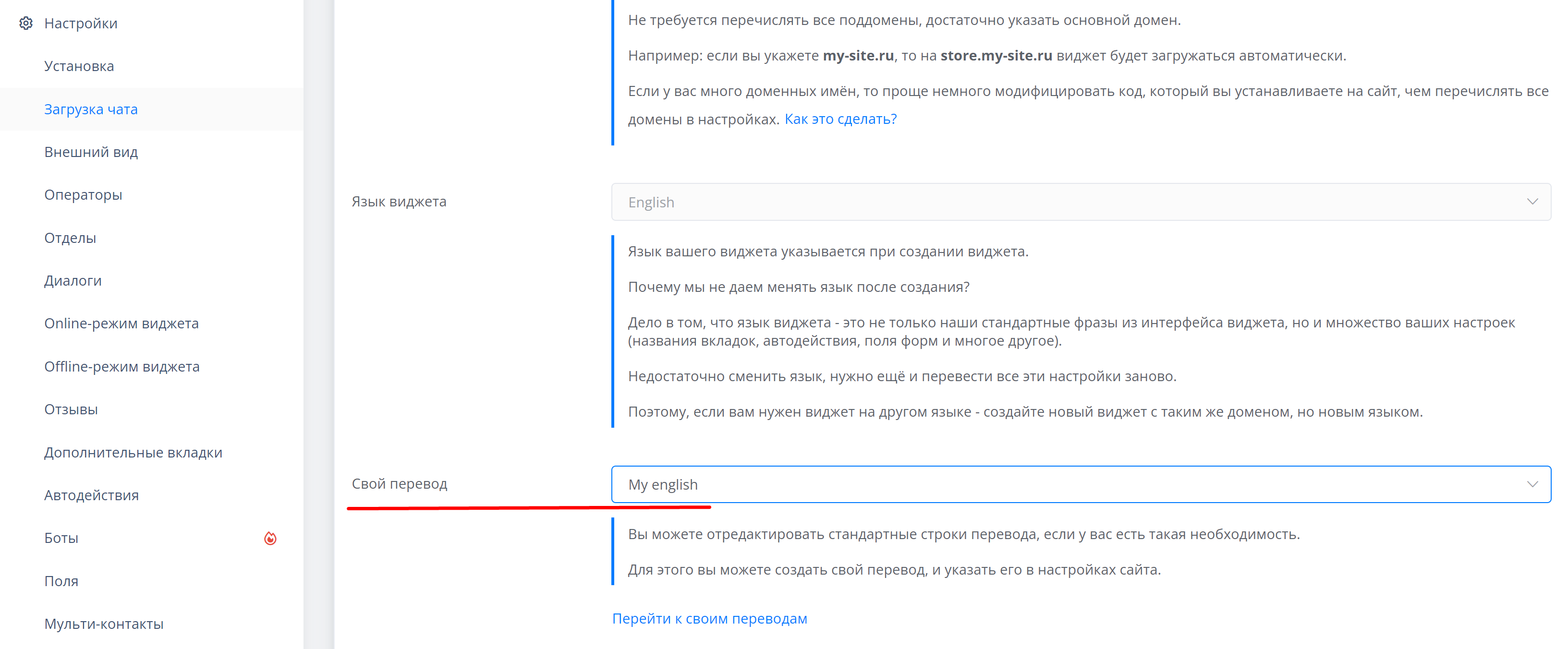 Выберите раздел "Загрузка чата" и укажите нужный перевод в "Свой перевод", нажмите на "Сохранить настройки"..png)