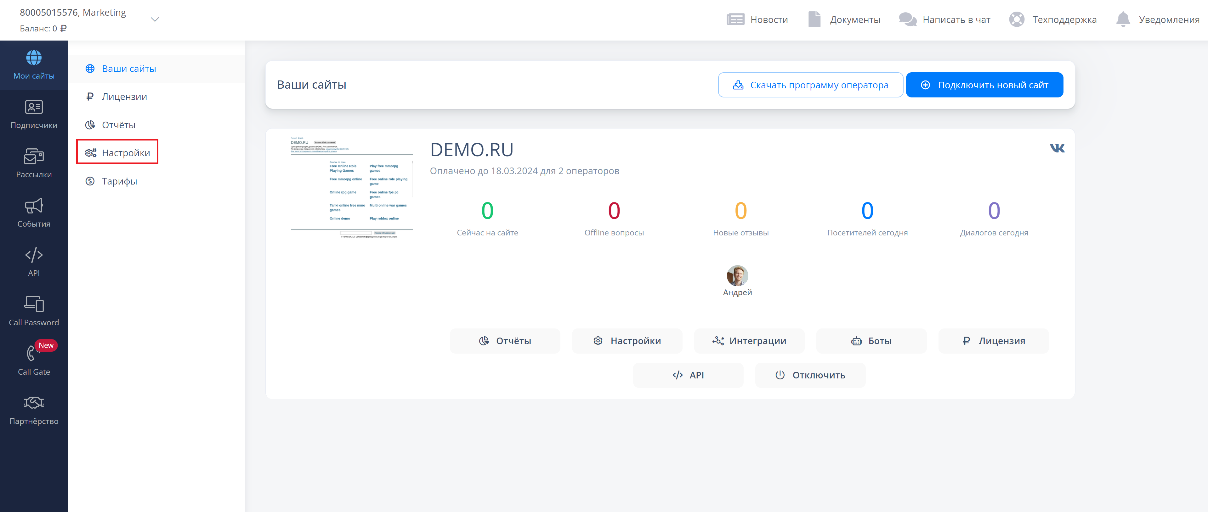 Теперь перейдите в раздел "Ваши сайты" и нажмите на "Настройки" в нужном проекте.