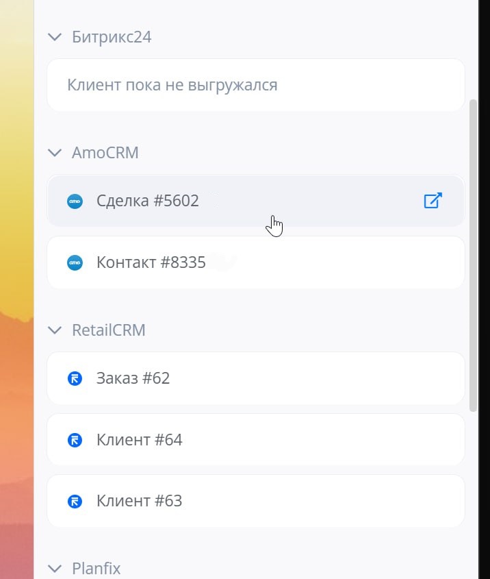 Теперь всё разбито по блокам, добавлены иконки сотового оператора и просмотр выгруженных в CRM сущностей.