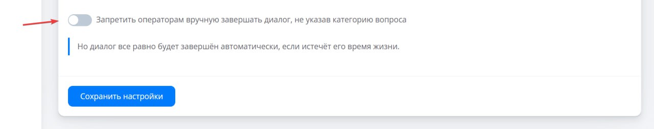 В настройках категорий вопроса вы можете запретить операторам вручную завершать диалог, в котором не указана категория вопроса.