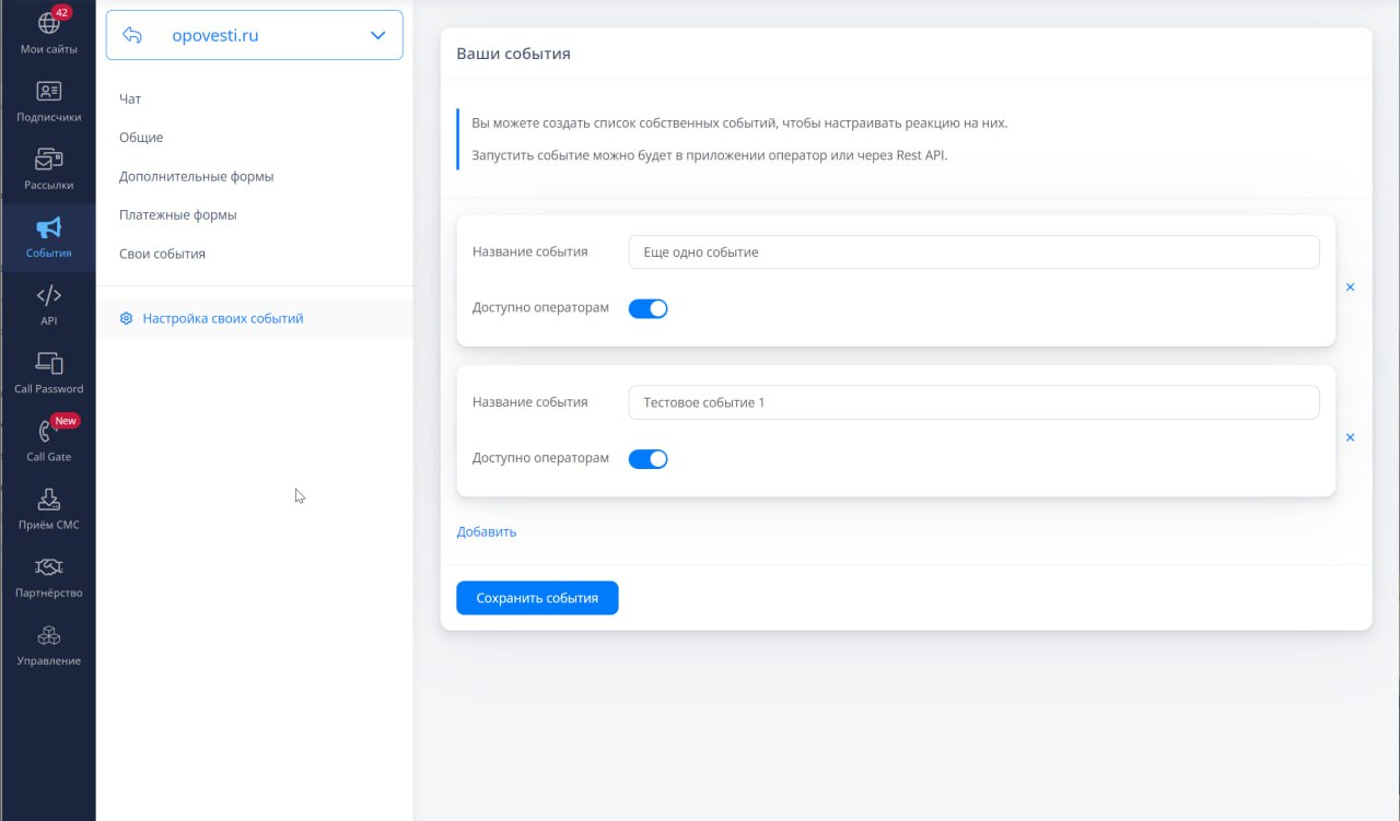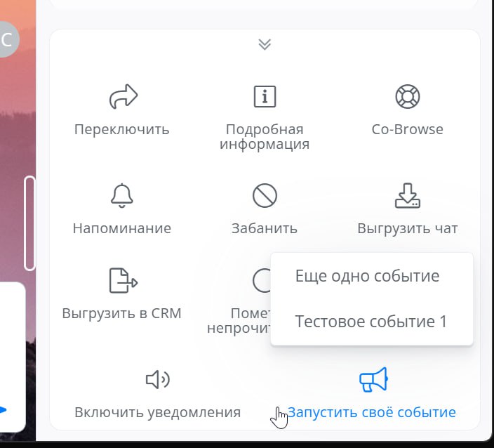 В настройках событий приложения можно создать свои события. Настраивать действия для них, как у других событий. Запускаются эти события вручную из приложения оператора. Например, можно создать событие "Создать заказ в CRM" и настроить на это событие создание заказа в RetailCRM.