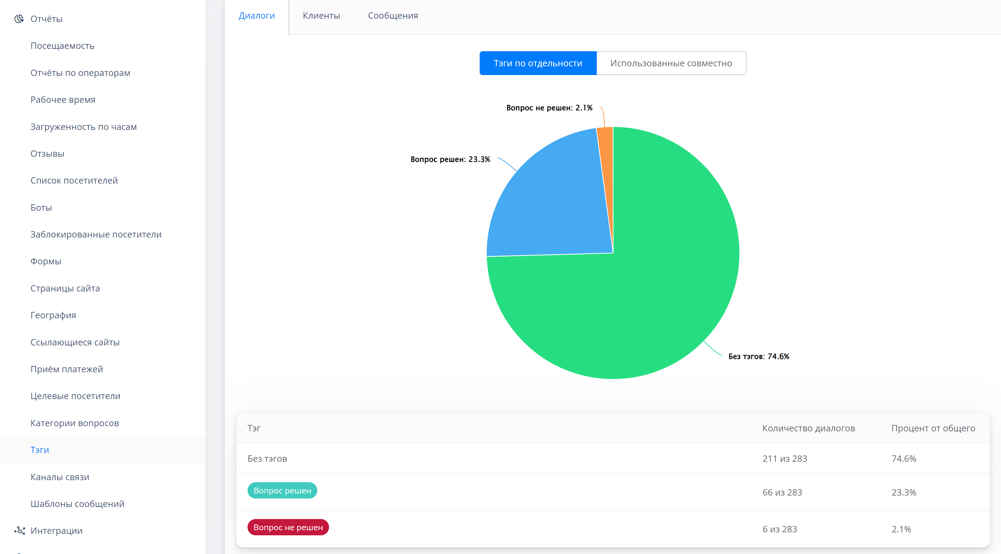 Вы можете увидеть полную статистику по проставленным тэгам к клиентам, диалогам и сообщениям. Сколько раз был использован конкретный тэг, отдельно или с другими тэгами.