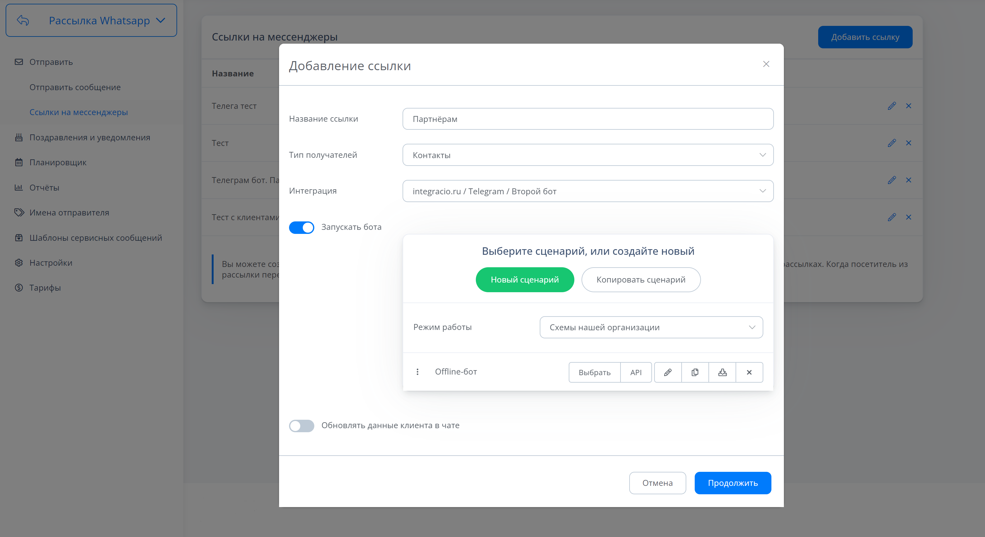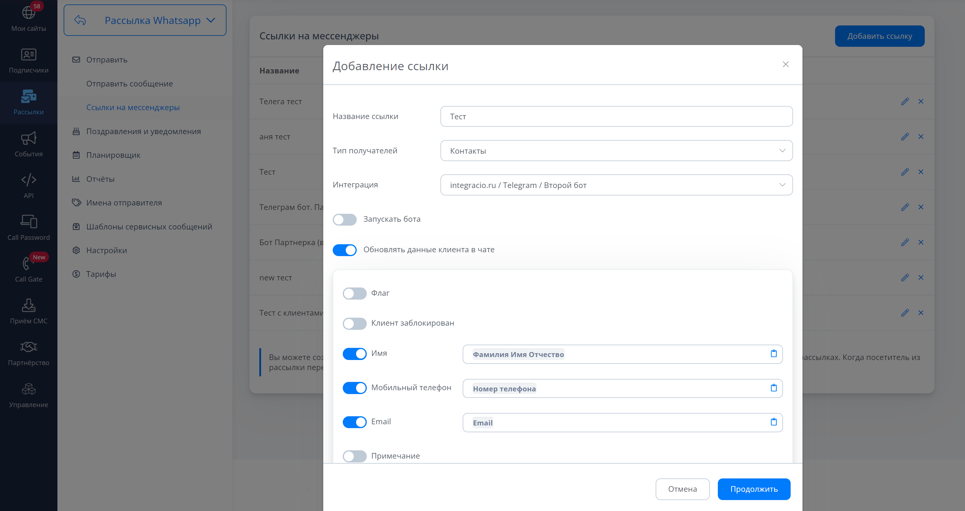 В рассылках появилась возможность создавать ссылки для запуска подключенных Telegram, WhatsApp, Viber и ВК ботов и/или обновлять данные клиента в онлайн-чате, используя подстановки.