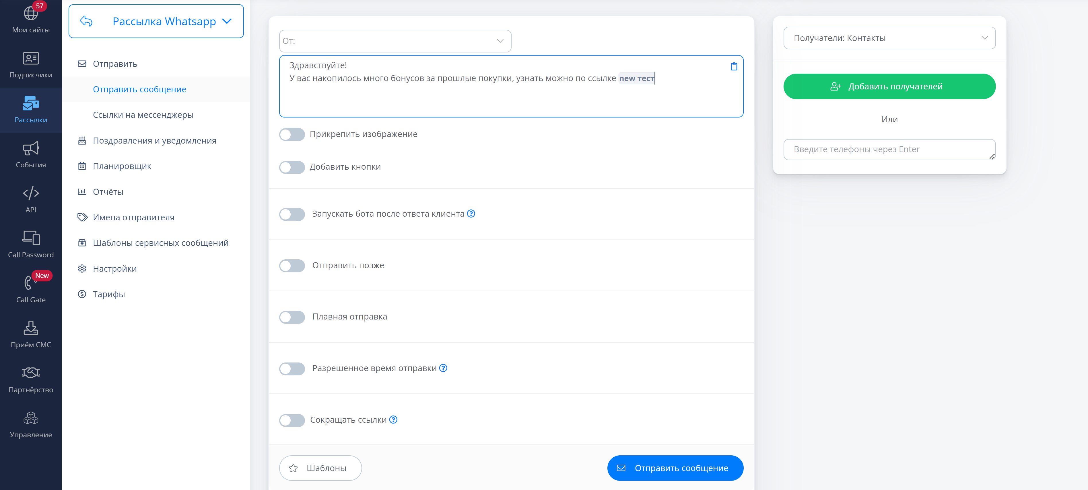 При создании рассылки укажите в сообщении ссылку на мессенджеры и клиенты, которые по ней перейдут автоматически попадут в подписчики вашего бота - это позволит расширить базу клиентов, которым можно отправлять сообщения в мессенджеры, тем самым снизить расходы на рассылку и вместо дорогой СМС, отправлять сообщение в недорогой и удобный для клиентов мессенджер.